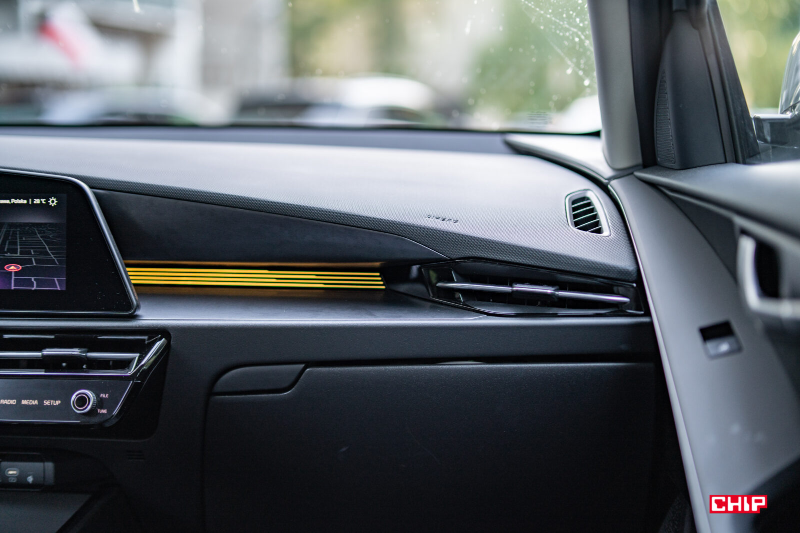 Kolejnym przyciągaczem wzroku są plastiki. Niro jest dobrze wykonanym autem, ale dobór materiałów… Listę otwiera ogromna bryła piano black na tunelu środkowym. Dalej mamy wielki kawał plastiku na drzwiach i choć wygląda efektownie, to szybko się palcuje i okrutnie zbiera kurz. Przyczepię się też do deski rozdzielczej, która jest pokryta bardzo przyjemną w dotyku gumą, ale nieco zbyt jasną. W słonecznie dni jej całą powierzchnia dosyć mocno odbija się w przedniej szybie. To nie jest problem, który będzie występować cały rok, ale mimo wszystko, jest.
