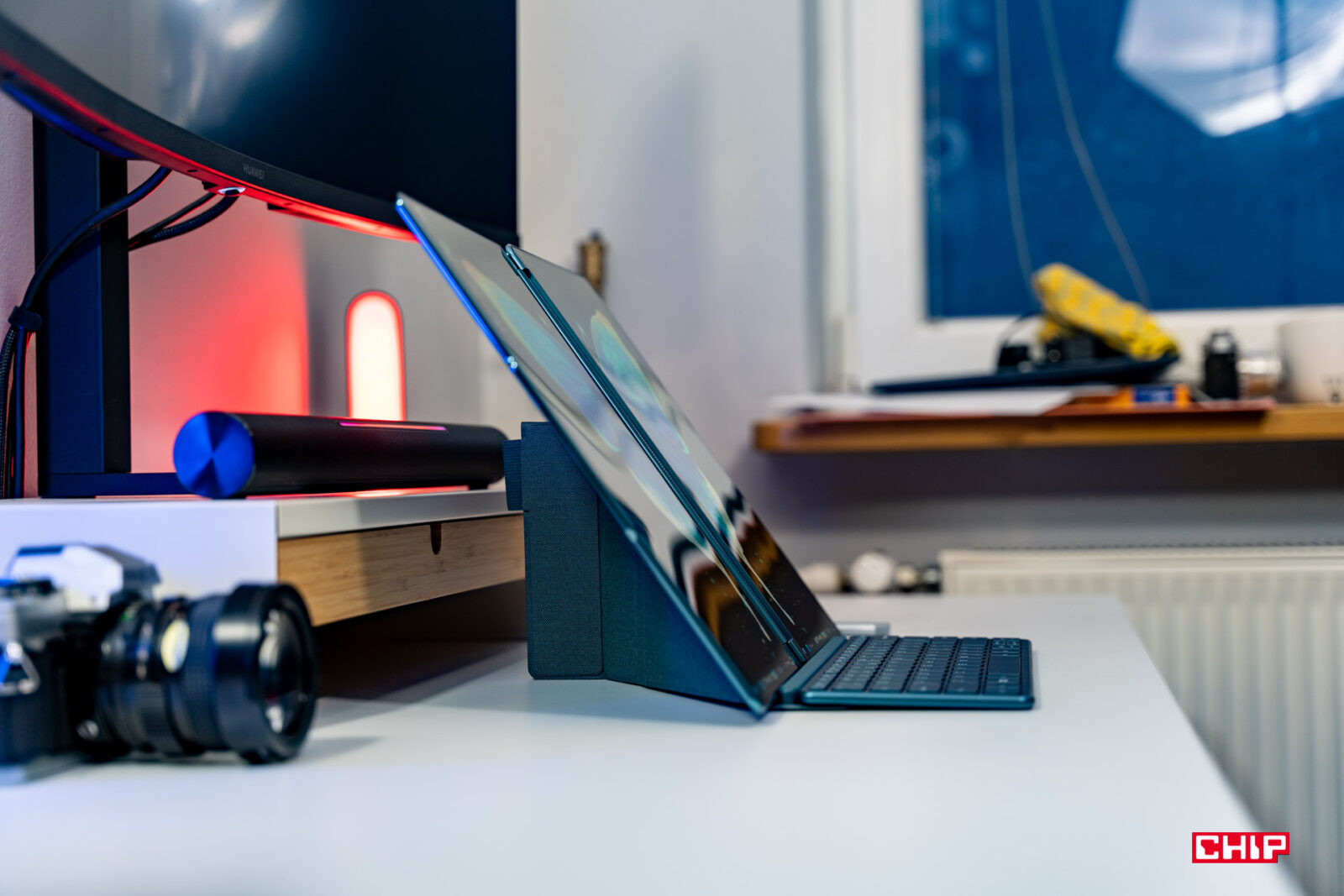 W pudełku znajdziemy użyteczny, zasilany bateryjnie rysik. Dalej mamy kartonową podpórkę, która podnosi tylną część laptopa kiedy postawimy go na biurku. Najważniejsza jest w tym jednak klawiatura, zamknięta w sztywnym, składanym etui. Klawiatura jest bezprzewodowa i magnetyczna. Możemy ją położyć na przed komputerem, przyczepić do dolnego ekranu, albo do składanej podstawy. Tę formujemy z pokrowca na klawiaturę i na niej możemy postawić laptopa w pionie lub poziomie. Możliwości ustawienia tej konstrukcji jest cała masa, więc nie będę Wam tego po kolei opisywać, możecie zobaczyć to na zdjęciach.