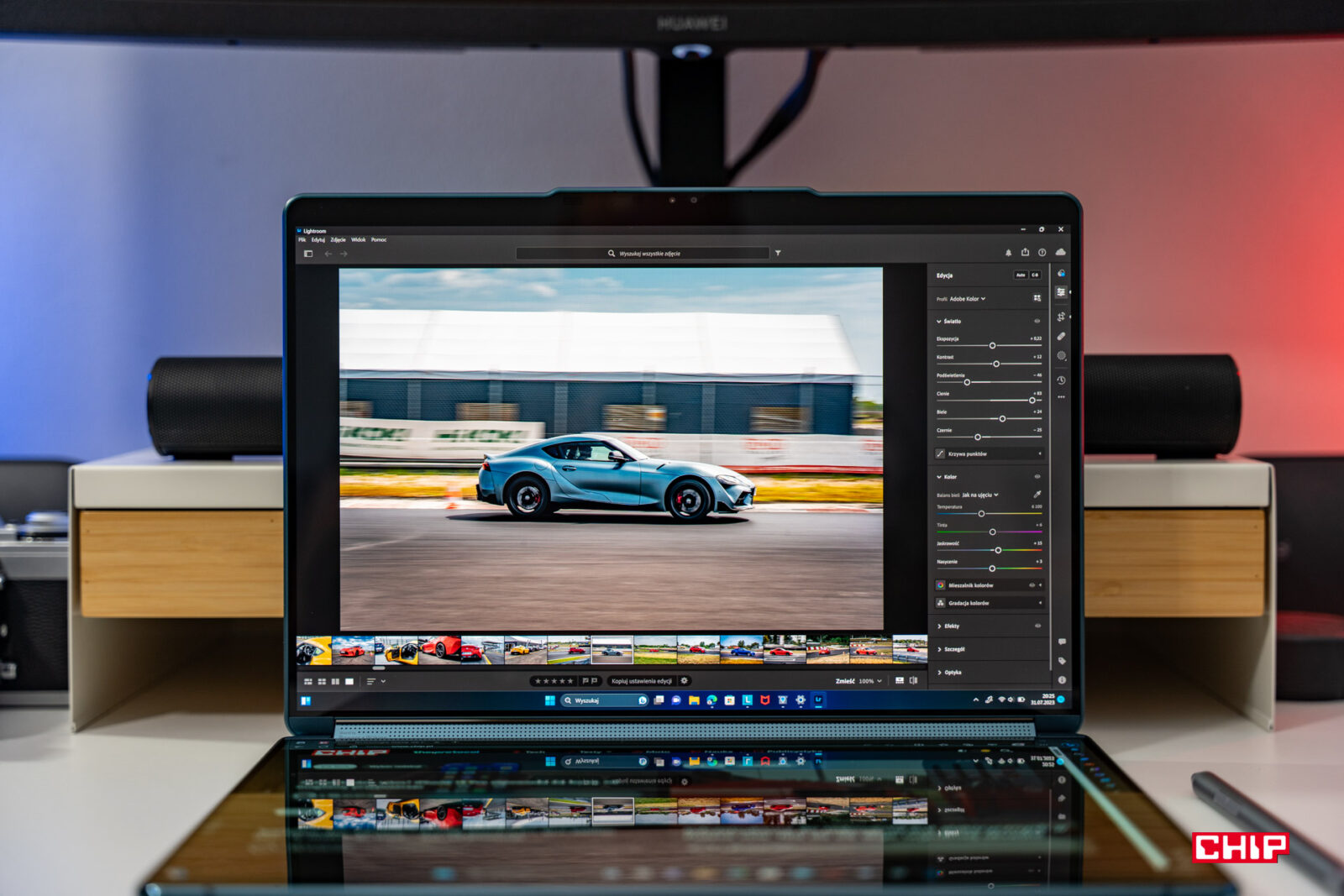 Jeśli chodzi o wydajność to podzespoły wystarczają w pełni do pracy biurowej i częściowo kreatywnej. Mamy tu procesor Intel Core i7-1355U, 16 GB pamięci RAM (LPDDR5X), dysk SSD PCIe o pojemności 1 TB i zintegrowaną grafikę Intel Iris Xe. Częściowo kreatywnej, bo o ile do podstawowej obróbki zdjęć w Lightroomie czy sklejaniu filmów w zupełności wystarcza, tak jeśli chcielibyśmy odszumić większą liczbę fotografii, albo wyrenderować gotowy film to musimy uzbroić się cierpliwość. Szczególnie względem laptopów z kartami graficznymi GeForce RTX czy sprzętem Apple’a.