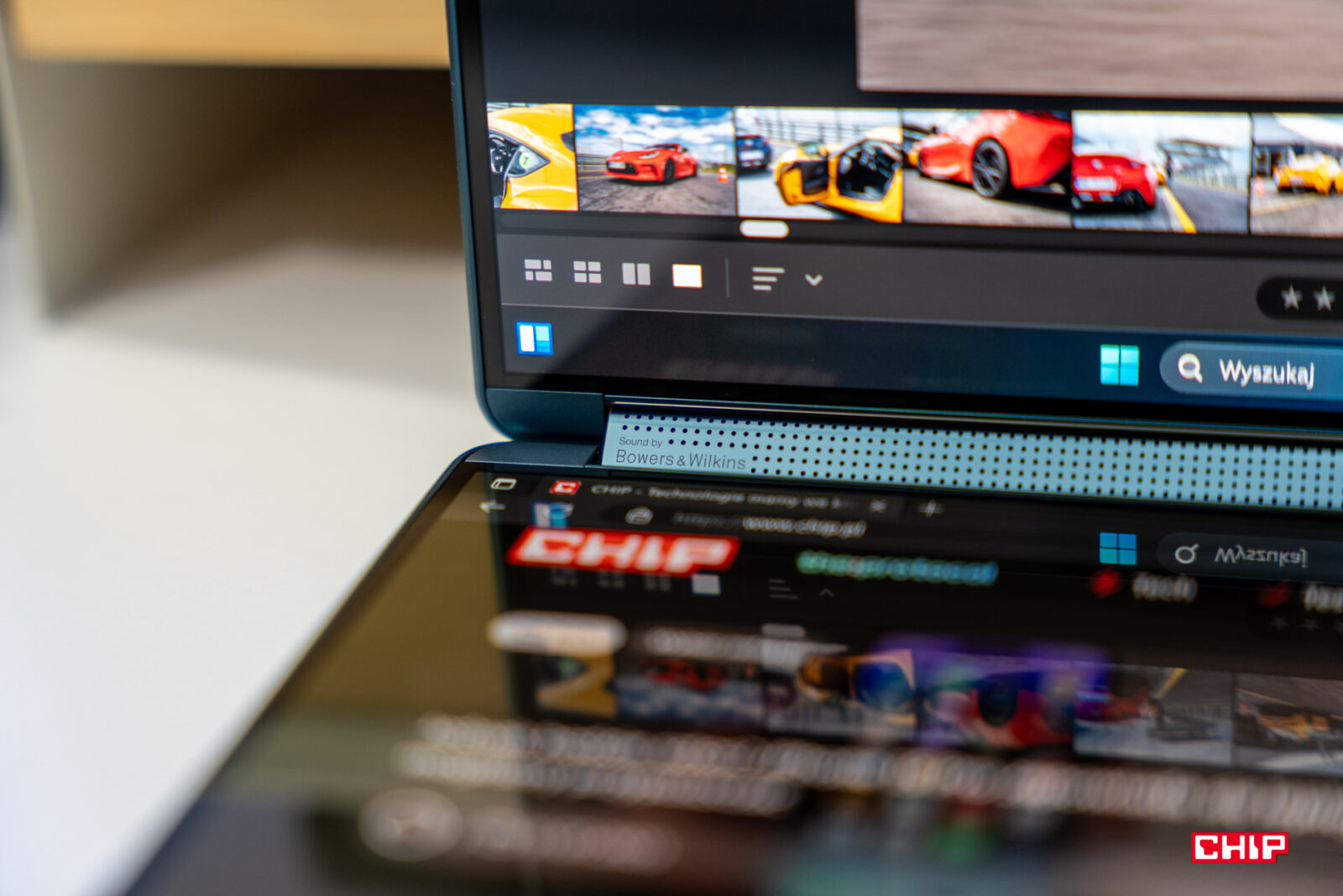 Konstrukcyjnie przyczepię się do jeszcze jednego elementu. Połówki obudowy nie są takie same. Dolna jest grubsza i kiedy postawimy laptop pionowo, mając ekrany obok siebie, to dosyć mocno rzuca się w oczy.