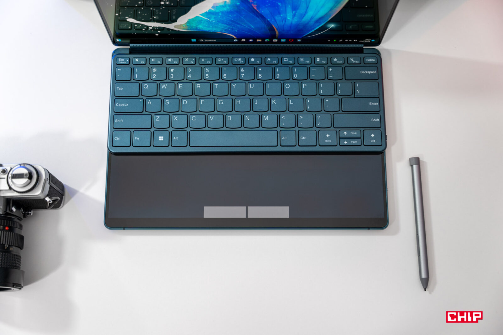 Klawiatura fizyczna jest uniwersalna. Działa domyślnie z laptopem, ale też przez Bluetooth można ją podpiąć do dowolnego urządzenia. Ma klasyczne, laptopowe wymiary, ale tylko wizualnie przypomina klawiatury z laptopów Lenovo. Ma rekordowo niski skok. Chyba nie widziałem jeszcze klawiatury z tak płytko wciskającymi się przyciskami, ale nie nazwałbym tego wadą. Dzięki temu pisze się na niej bardzo szybko, a jako że jestem fanem niskoprofilowych klawiatur, chętnie bym korzystał z niej na co dzień. Magnesy klawiatury są bardzo silne i skutecznie trzymają się laptopa. Nie ma mowy o żadnym przesuwania się w trakcie pisania.