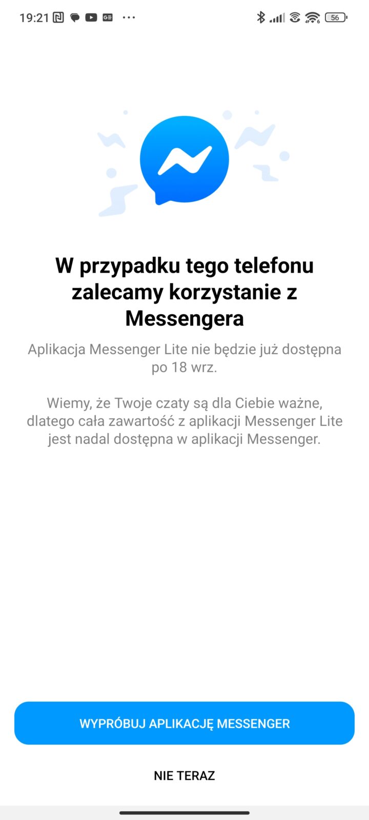 Messenger Lite nigdy nie doczekał się bardziej zaawansowanych funkcji (wideorozmowy, relacje), do których zachęcał Facebook, nie wyświetlał reklam (więc i nie zarabiał), a wciąż wymagał zespołu, który utrzymywał go przy życiu. Nic zatem dziwnego, że Meta w końcu postanowiła wyciągnąć wtyczkę i aplikacja została wycofana ze sklepów – obecnie pobrać ją mogą wyłącznie użytkownicy, którzy korzystali z niej wcześniej. Uruchamiany Messenger Lite zaczął też wyświetlać informację, że będzie działać wyłącznie do 18 września i zachętę, by zapoznać się z pełną wersją aplikacji Facebook Messenger.