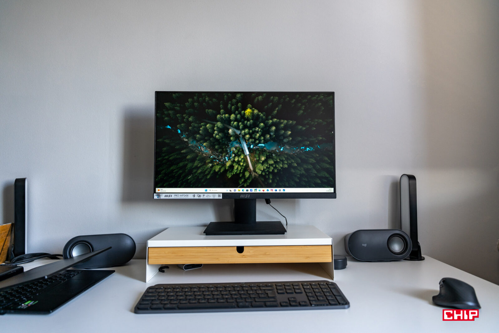 MSI PRO MP241X to monitor, który nie zajmie dużo miejsca na biurku. Jest bardzo płytki, więc może stać bardzo blisko krawędzi biurka, a dzięki sporej wielkości podstawie jest stabilny.