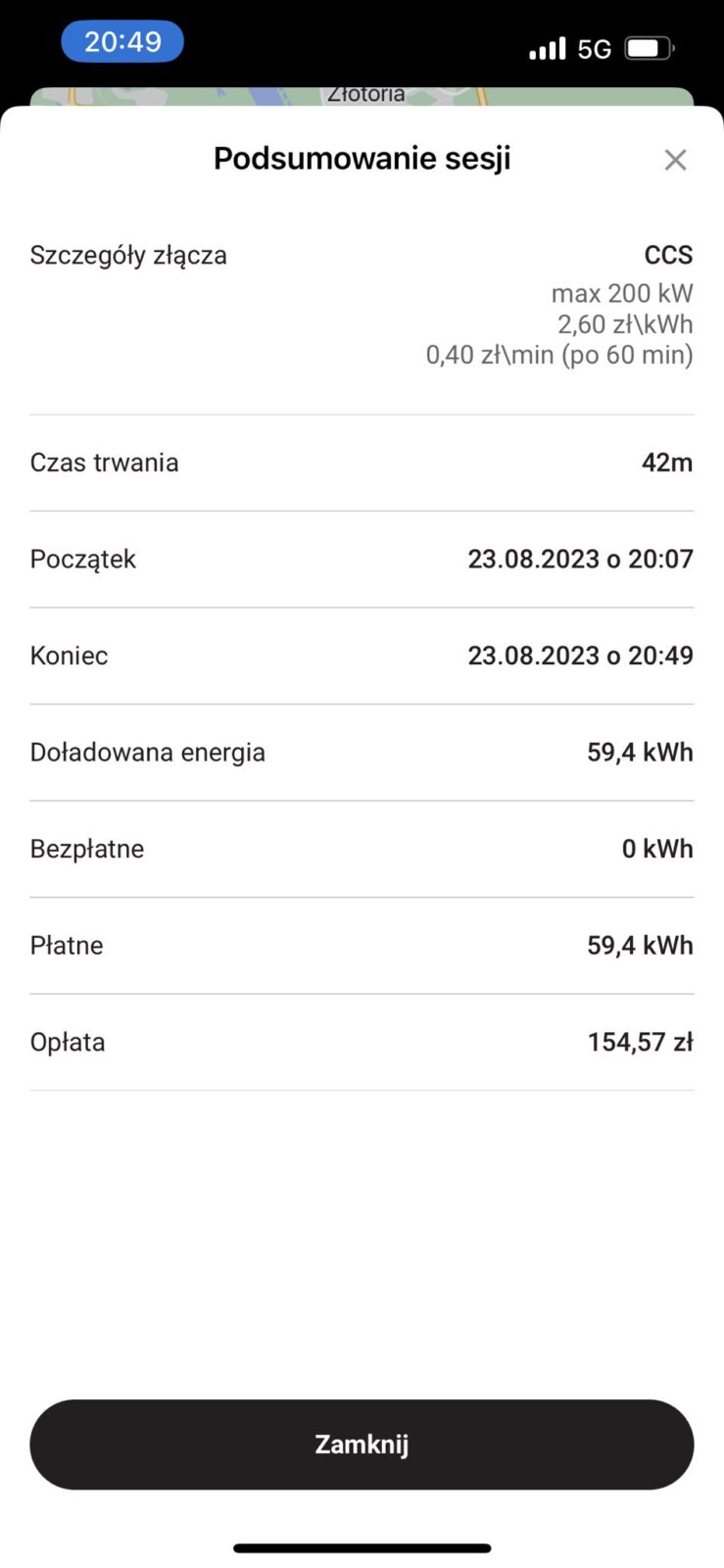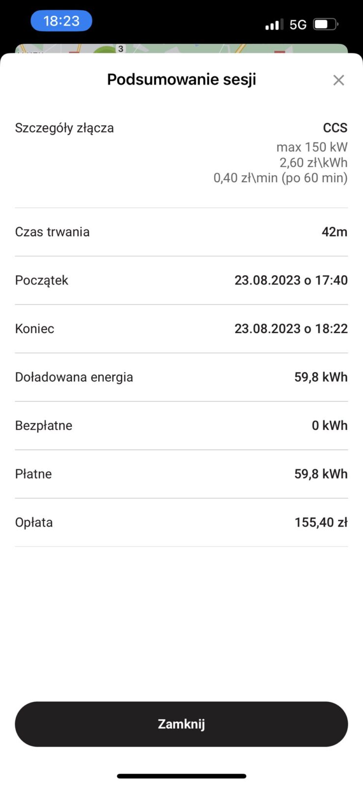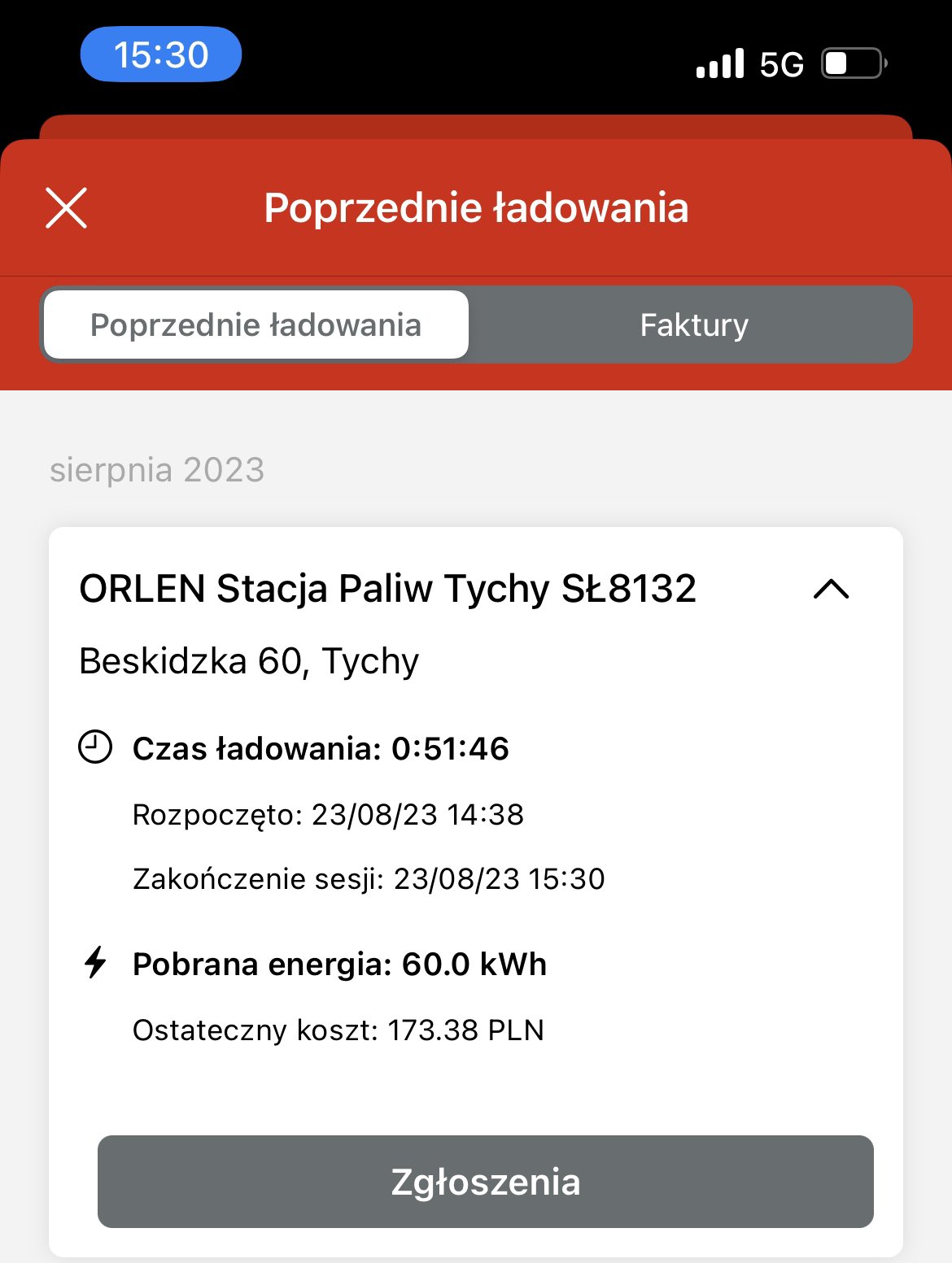 Pierwsza sesja ładowania trwała blisko 52 minuty. W tym czasie uzupełniłem akumulator do 80% (ładowanie do 100% byłoby bez sensu, bo ostatnie 20% to zawsze najwolniejsze ładowanie na krzywej) i zapłaciłem za to 173,38 zł.