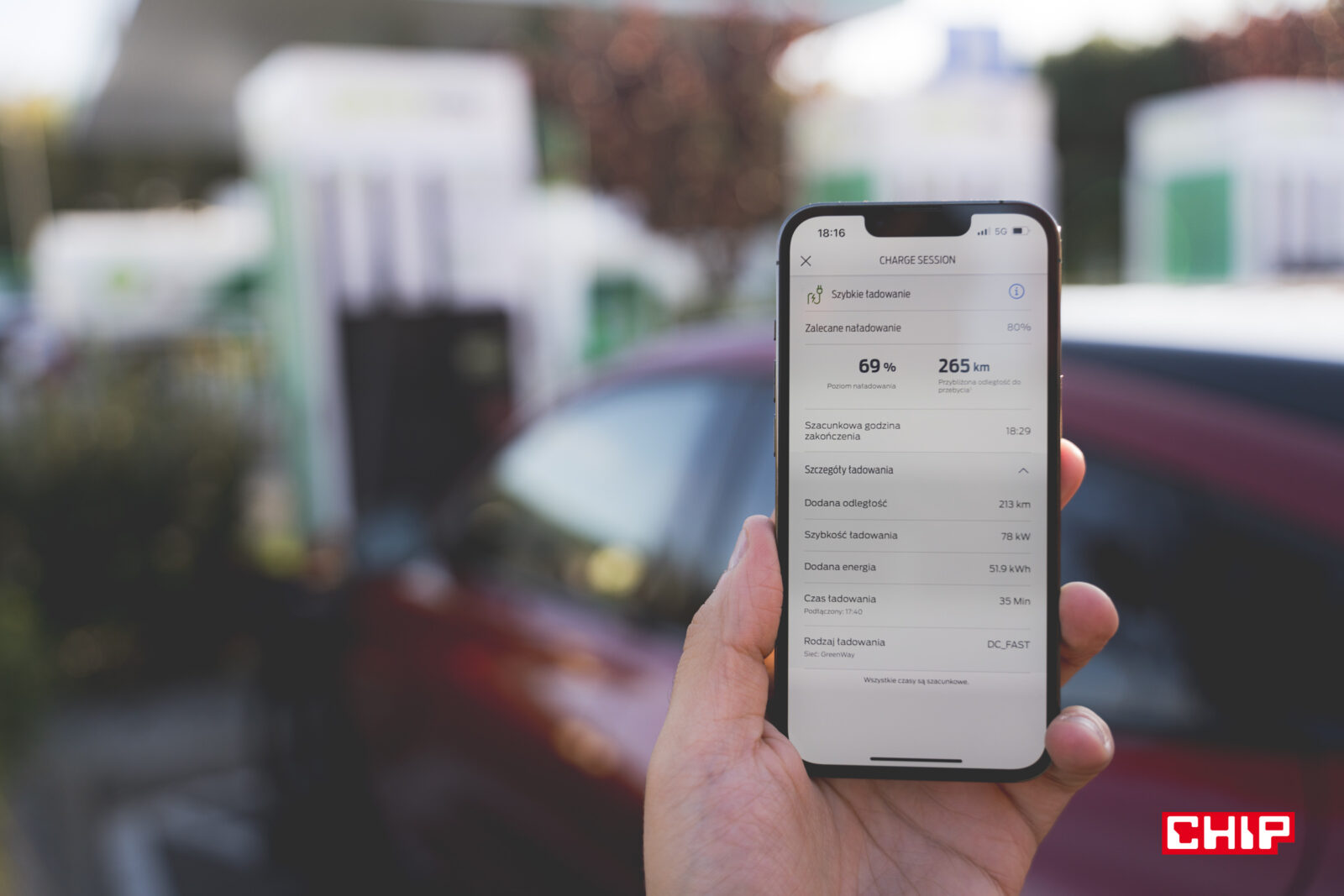 Jednak Ford po przekroczeniu 50% poziomu naładowania drastycznie zwalnia i zamiast przyjmować ponad 100 kW, przyjmuje raptem 77 kW. Finalnie naładowanie do 78% potrwało 42 minuty i kosztowało 155,40 zł.