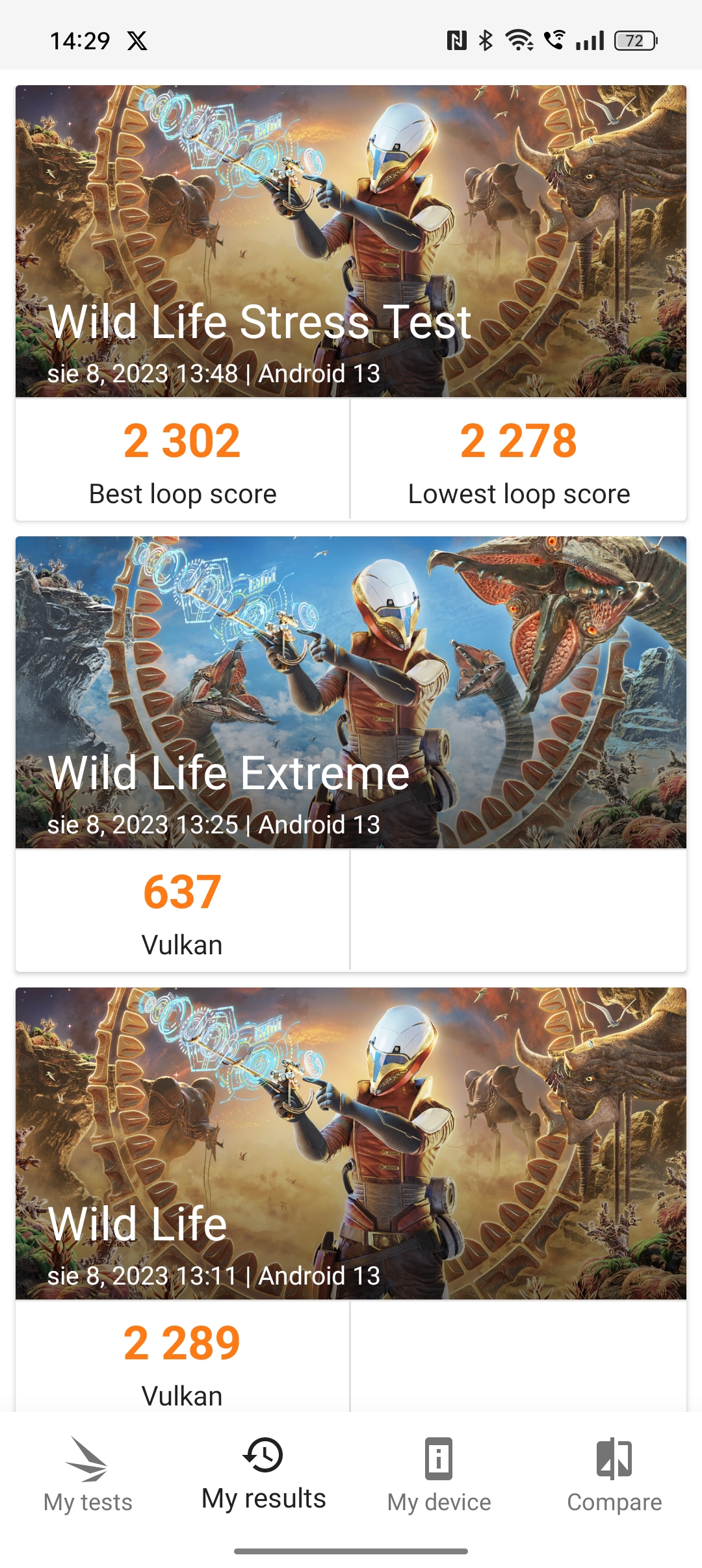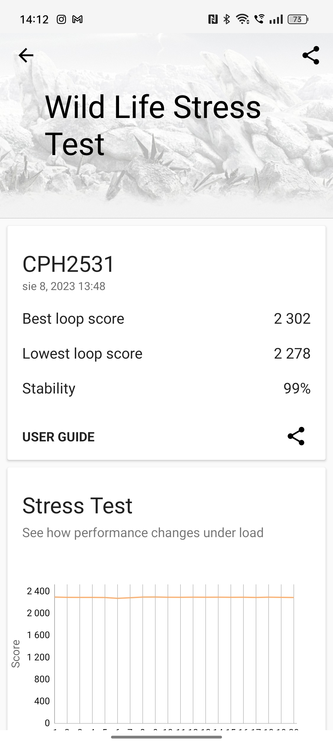 - Wild Life Extreme Stress Test: 2302/2278 pkt, stabilność 99%