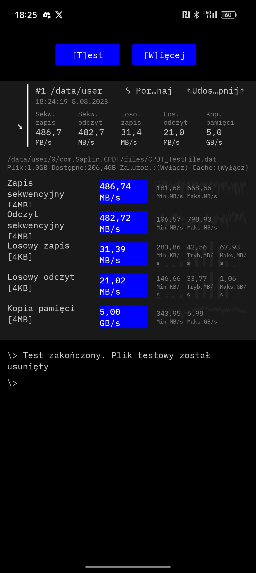 - szybkość ciągłego zapisu danych: 486,74 MB/s,