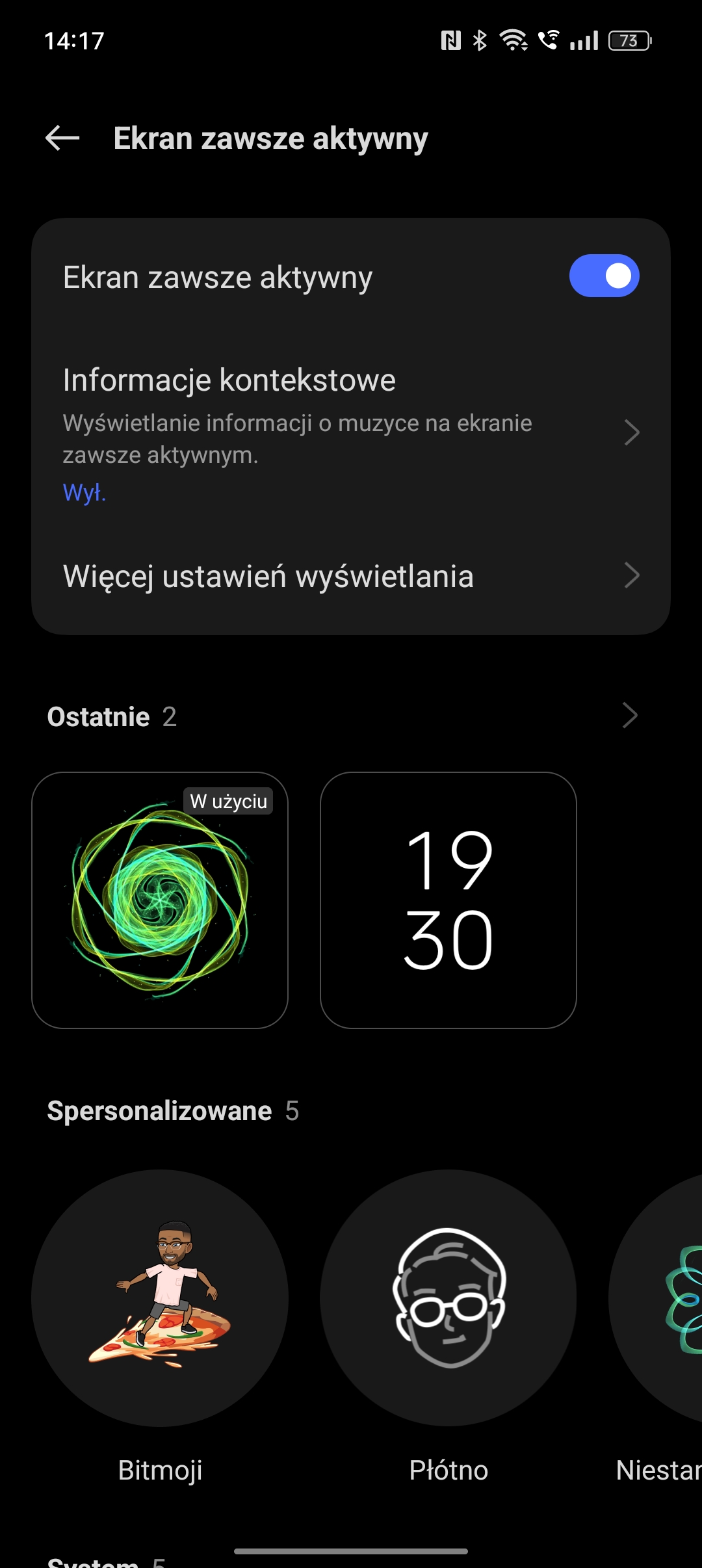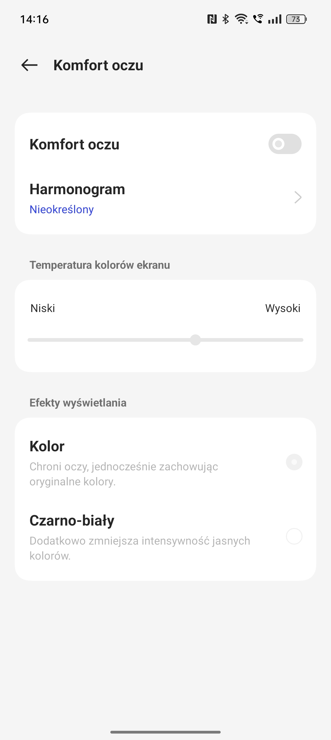Nie zabrakło oczywiście trybu ochrony oczu, ograniczającego składową niebieską. Poza możliwością wyboru poziomu ocieplenia barw interesująca jest możliwość przełączenia obrazu w tryb monochromatyczny. Dobrze się w ten sposób czyta, ale praktyczna użyteczność jest mimo to niewielka. Znacznie bardziej użyteczny jest Always-on Display, który można w szerokim zakresie dostosować (także jeśli chodzi o to jak bardzo „zawsze” jest aktywny), jeśli chodzi o zakres i sposób prezentacji informacji.