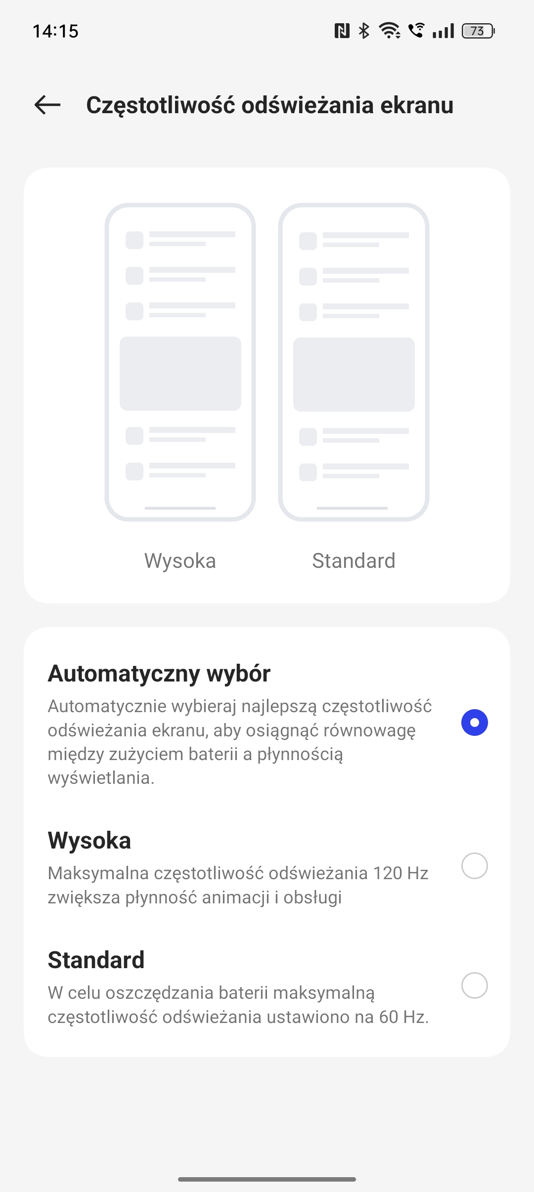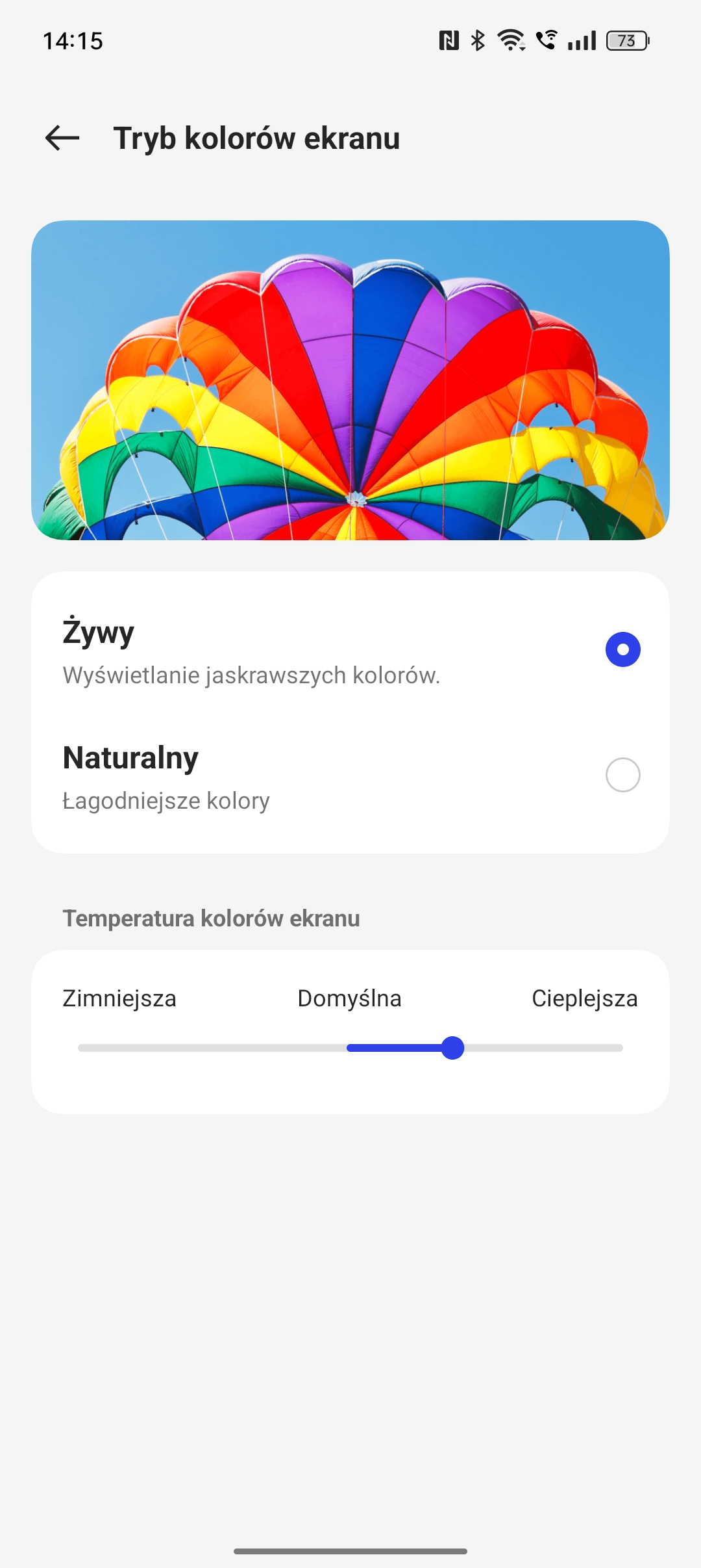 Rozdzielczość ekranu wynosi 1080 x 2412, co przy przekątnej 6,7″ daje gęstość 394 ppi. Odświeżanie to standard: dostępny jest tryb adaptacyjny do 120 Hz (automatyczny wybór pomiędzy 60, 90 i 120 Hz) oraz dwa tryby zwykłe, 120 i 60 Hz. Podczas testów pozostawiłem ustawienie adaptacyjne, zupełnie wystarczające w praktyce. Reprodukcja kolorów stoi na dobrym poziomie. Dostępne są dwa tryby wyświetlania, standardowy odpowiadający sRGB i żywy odpowiadający DCI-P3. Z tego ostatniego korzystałem podczas testów, lekko ocieplając biel za pomocą suwaka temperatury barwowej – takie ustawienie uważam za optymalne.