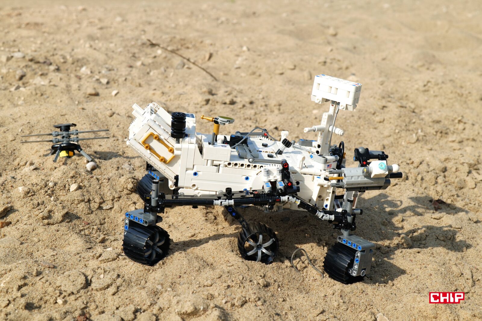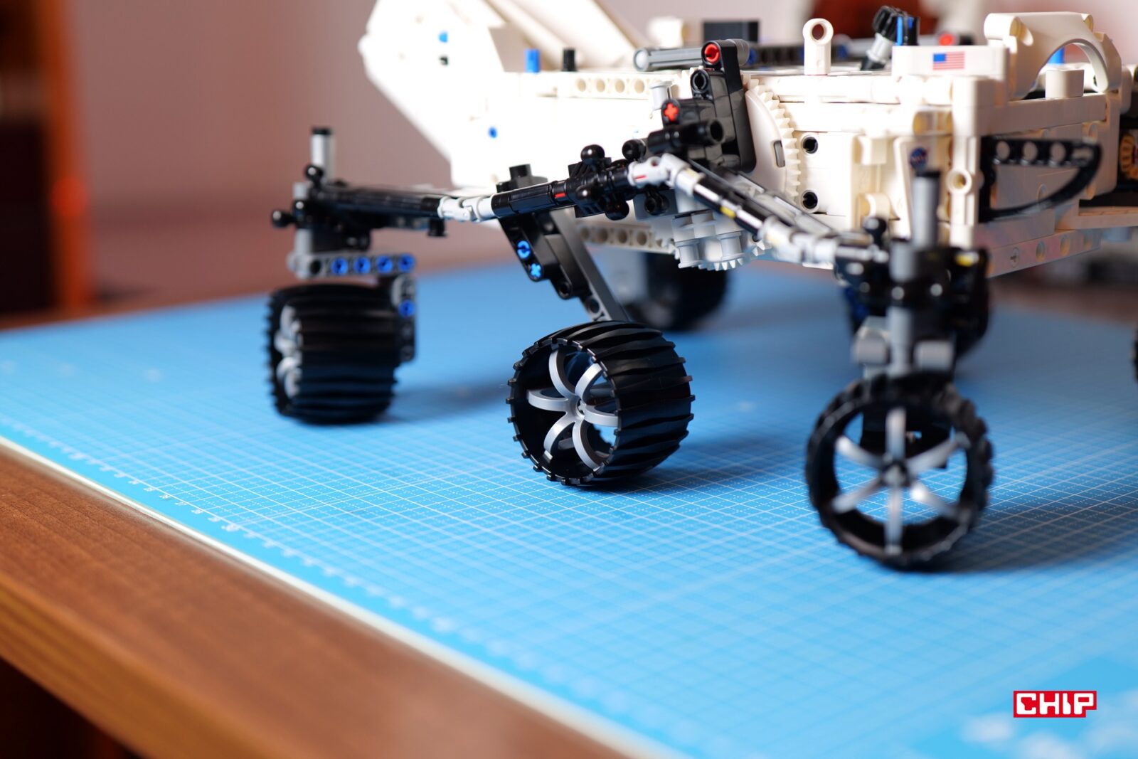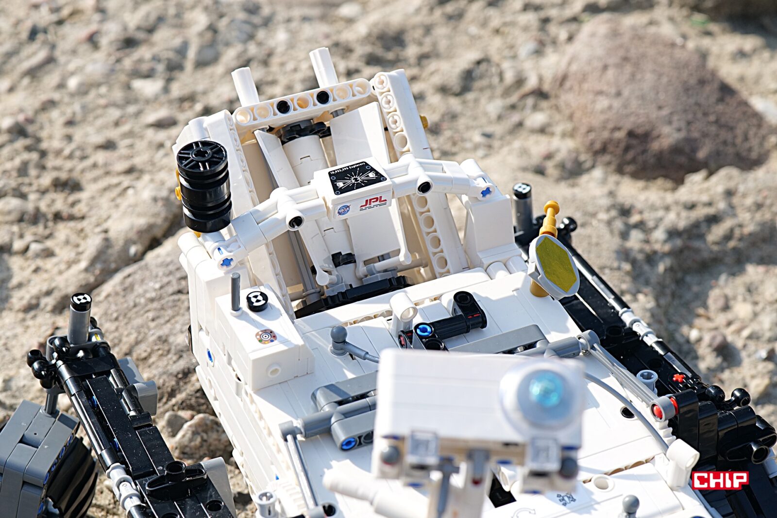 Odnoszę wrażenie, że zestaw LEGO z łazikiem Perseverance stoi w rozkroku między zabawką na dywan, panele i asfalt, a zestawem kolekcjonerskim. Mechanizmy poruszające elementy są dość podstawowe i trudno mówić tu o powtarzalności. Z kolei choć pod kołami (z plastiku) jest duży prześwit i te obracają się gładko, tak nie sądzę, by zestaw wygrał starcie z mocniejszym podmuchem wiatru. Zbyt wiele elementów wystaje poza obrys całości. Z drugiej strony ma całkiem solidne zawieszenie jak na konstrukcję bez sprężyn. Mimo wszystko widzę w tym pojeździe ciekawostkę dla kolekcjonerów aniżeli zabawkę. Ci na pewno ucieszą się z ciekawych naklejek odwzorowujących nadruki, jakie znajduja się na Perseverance.