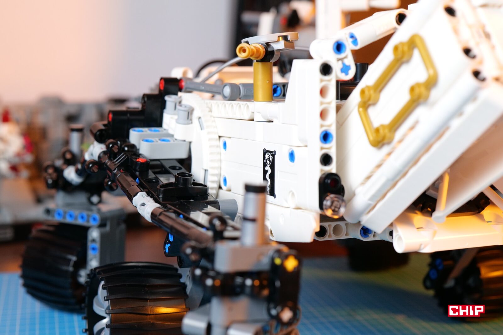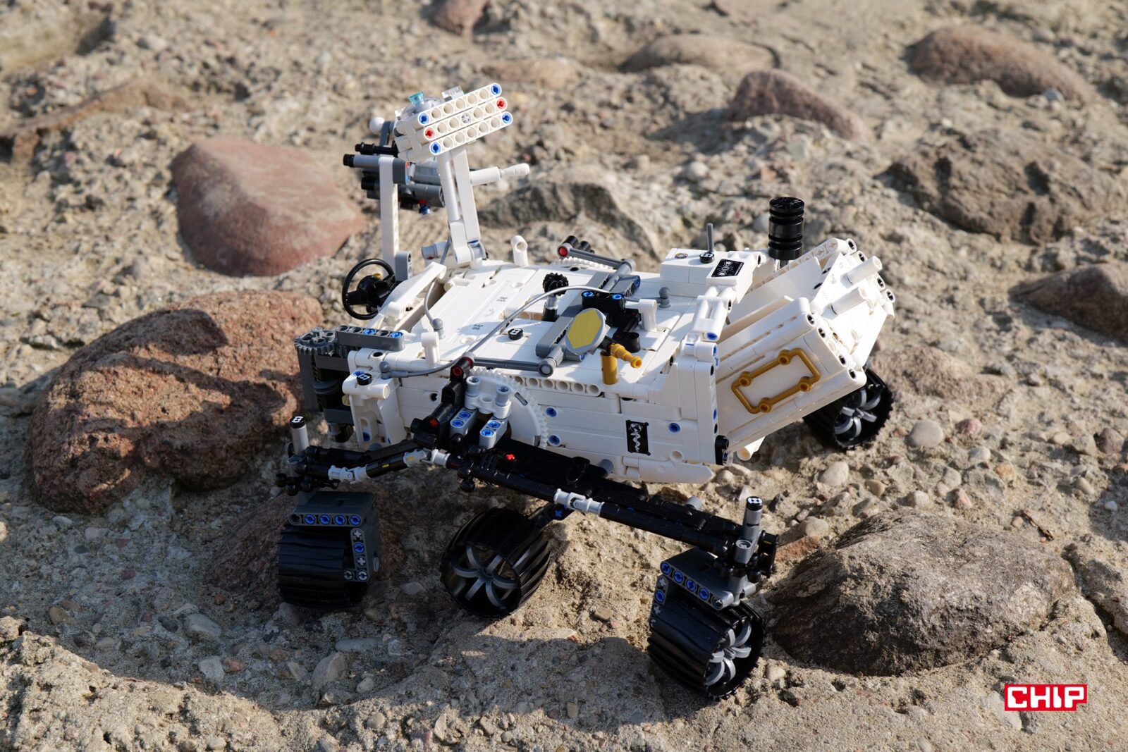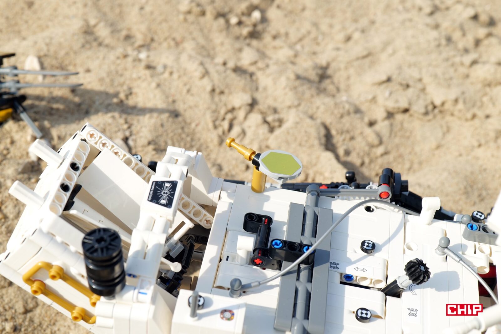 Odnoszę wrażenie, że zestaw LEGO z łazikiem Perseverance stoi w rozkroku między zabawką na dywan, panele i asfalt, a zestawem kolekcjonerskim. Mechanizmy poruszające elementy są dość podstawowe i trudno mówić tu o powtarzalności. Z kolei choć pod kołami (z plastiku) jest duży prześwit i te obracają się gładko, tak nie sądzę, by zestaw wygrał starcie z mocniejszym podmuchem wiatru. Zbyt wiele elementów wystaje poza obrys całości. Z drugiej strony ma całkiem solidne zawieszenie jak na konstrukcję bez sprężyn. Mimo wszystko widzę w tym pojeździe ciekawostkę dla kolekcjonerów aniżeli zabawkę. Ci na pewno ucieszą się z ciekawych naklejek odwzorowujących nadruki, jakie znajduja się na Perseverance.