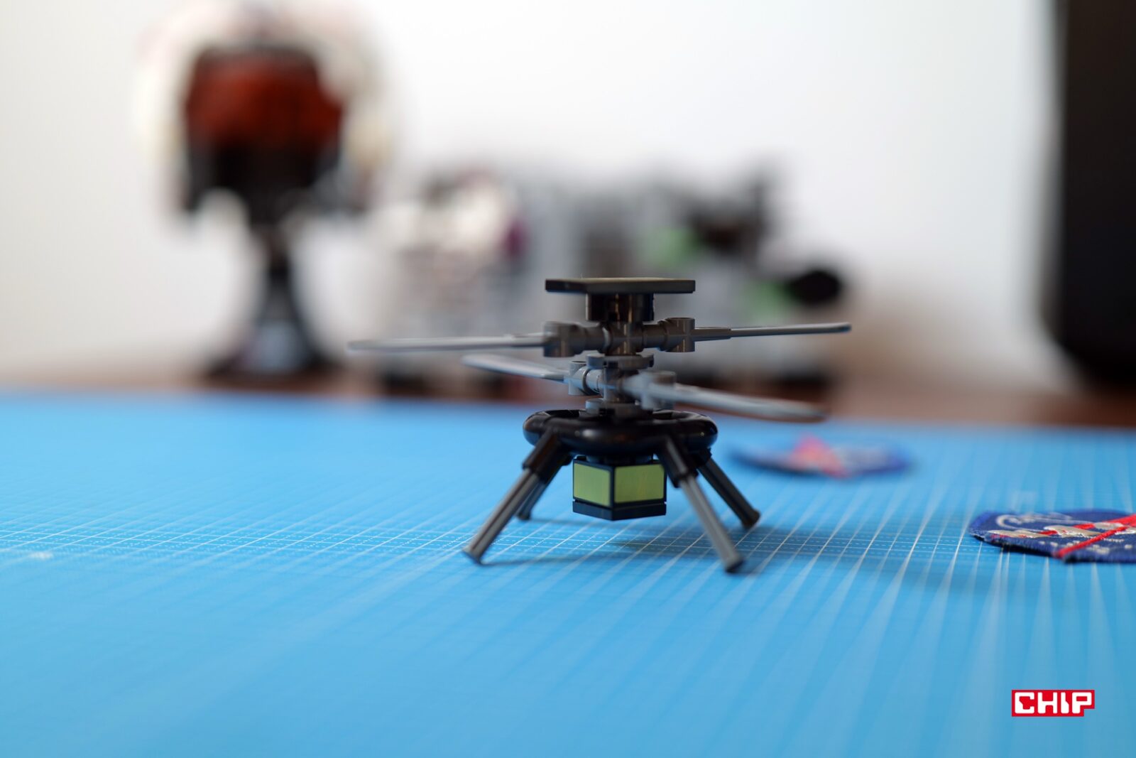 Trzeba przyznać, że Perseverance w wydaniu LEGO to całkiem spory zestaw. Po złożeniu musimy wygospodarować przestrzeń, która pomieści konstrukcję o wymiarach 23x32x23 cm. Do tego nie ma na łaziku miejsca, które byłoby, jak w rzeczywistości, stacją dokującą dla drona Ingenuity, bo ten ledwo utrzymuje się na płytce. Całość sprawia wrażenie zachowania odpowiedniej skali, dlatego szkoda, że nie udało się stworzyć chociażby uchwytu na zestaw. Z drugiej strony Ingenuity na Marsie ładuje się już wyłącznie poprzez dołączony panel solarny, więc jego rozdzielność od zestawu ma sens.