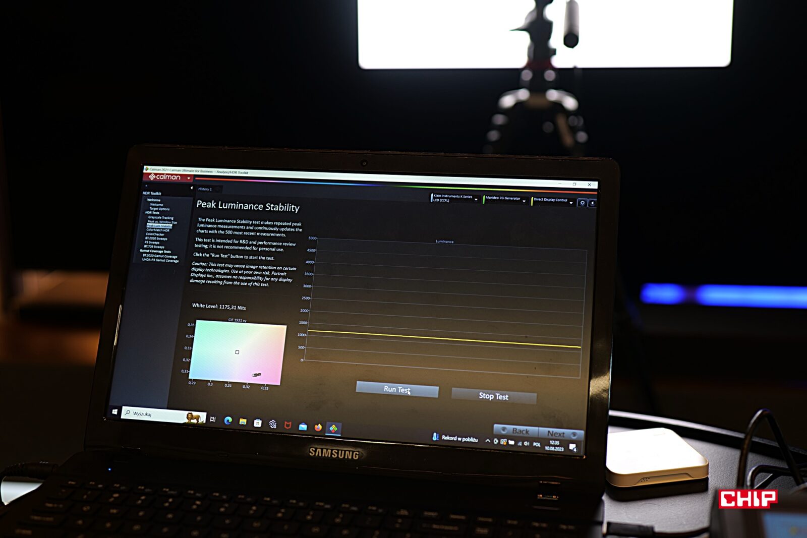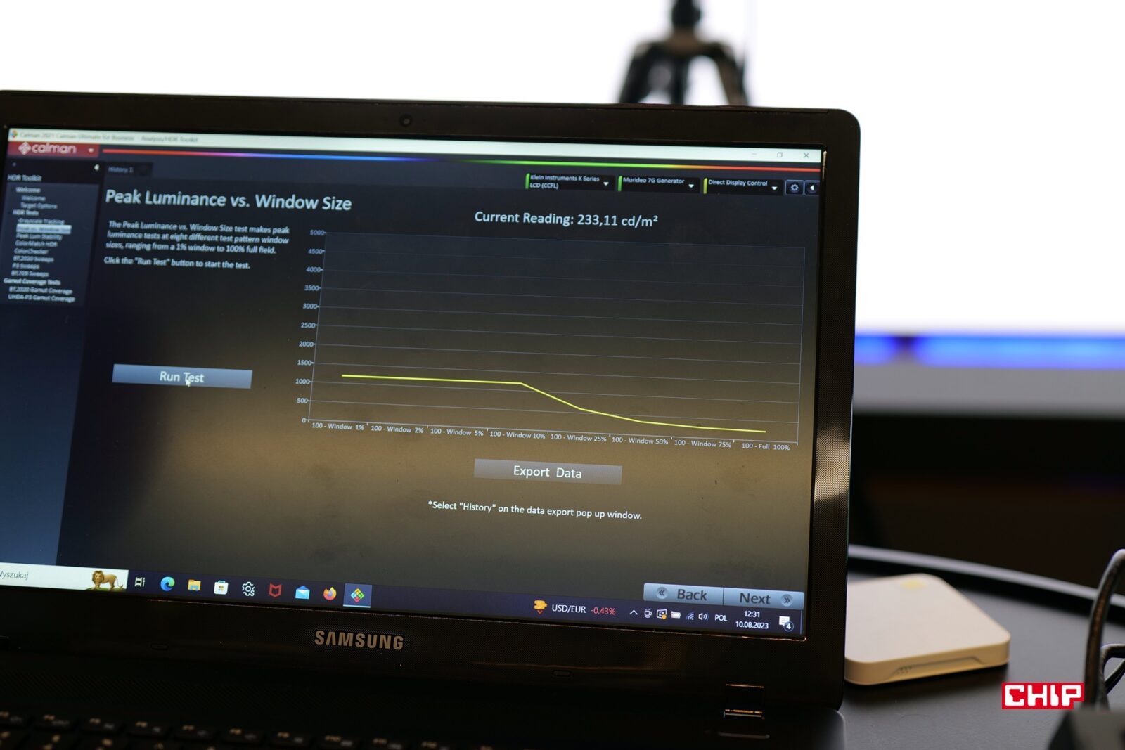 Na miejscu miałem okazję zobaczyć kilka testów Samsunga S95C. Przy użyciu kalibratora Klein Instruments oraz generatora obrazu Murideo 7G zweryfikowaliśmy, jak wygląda krzywa jasności przy różnym stopniu wypełnienia ekranu bielą. Przed testem zresetowano wszystkie ustawienia obrazu, więc wyniki zaserwowane przez S95C są tym, czego możemy spodziewać się zaraz po wyjęciu z pudełka.