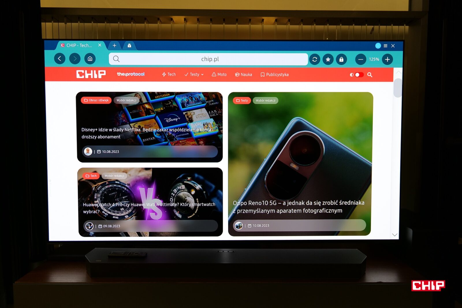 O jakość wyświetlanego obrazu nie musicie się martwić. Telewizor prezentuje też bardzo dobre kąty widzenia. Nie zawsze jest to oczywistością, zwłaszcza w rozwiązaniach z diodą organiczną. Obejrzałem na nim co nieco materiałów zarówno z Youtube, jak i wideo promocyjnych i w każdym z tych scenariuszy wyświetlany obraz wygląda bardzo przyjemnie dla oka. Nie odczułem, by telewizor proponował jakąś dominantę kolorystyczną. Materiały w standardzie HDR prezentowały szeroką paletę barw. Do pełni szczęścia zabrakło mi obejrzenia telewizji satelitarnej, ale jej jakości raczej nie uratowałyby nawet najmądrzejsze algorytmy. Chciałbym też, żeby panel był nieco mniej refleksyjny, ale to mogłoby wpłynąć na jakość obrazu.