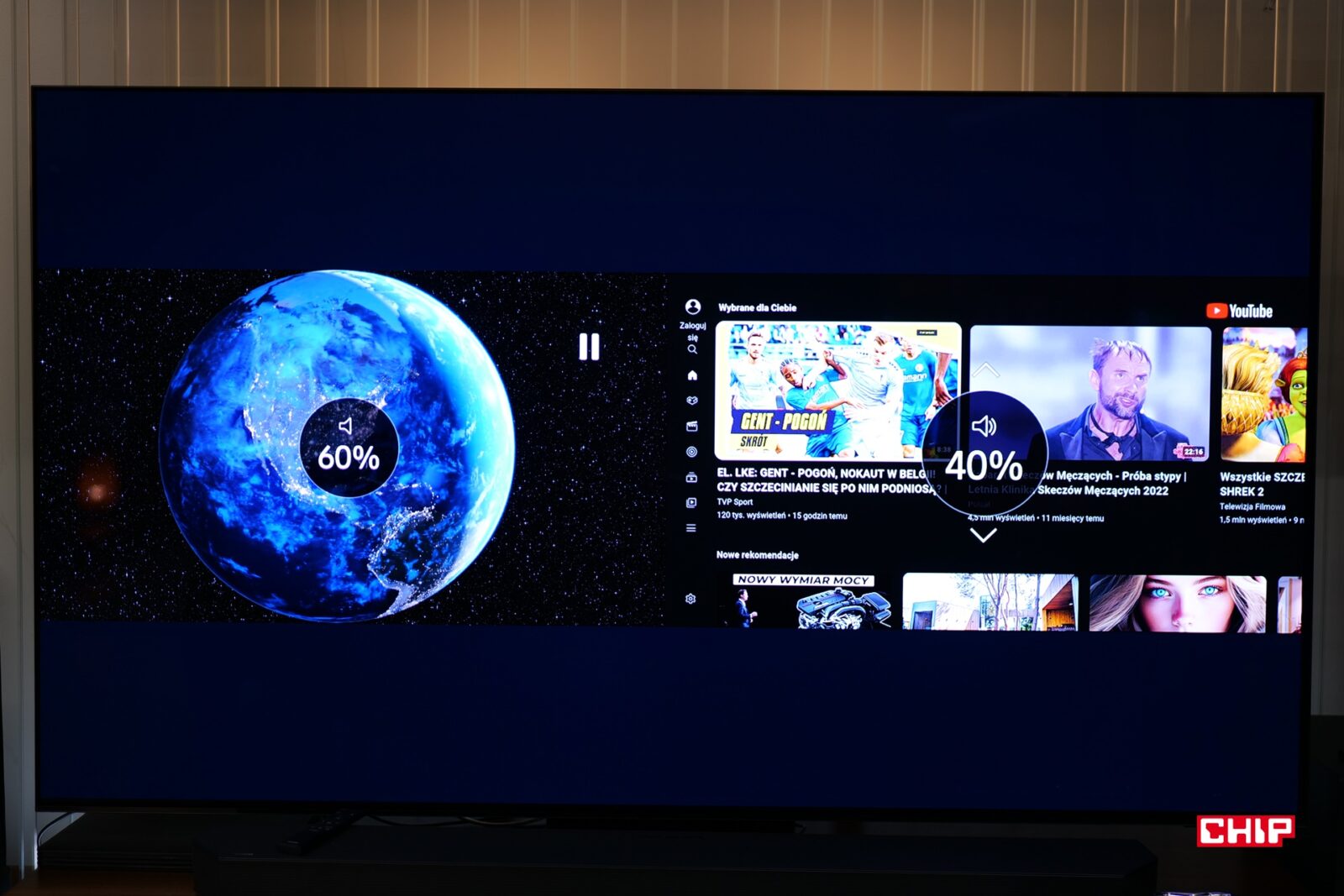 Oprócz tego producent zaimplementował Dźwięk Podążający za Obiektem+, czyli umieszczenie dźwięku w przestrzeni według tego, co dzieje się na ekranie. Najciekawiej w obliczu polskiego odbiorcy mogą jednak wypaść Aktywny Wzmacniacz Głosu, który eksponuje dialogi oraz Adaptacja Dźwięku+, która dopasowuje dźwięk do pomieszczenia. Rozwiązań dla obrazu jest jeszcze więcej, począwszy od trybu filmowego, po podbijanie rozdzielczości. Mnie za to spodobała się dzielenie ekranu między dwa źródła obrazu (tylko jedno może być sygnałem HDMI) z miksowaniem dźwięku. Jeśli jednak każdy chce obejrzeć swój program bez zakłóceń, to do S95C możemy podłączyć dwa urządzenia Bluetooth.