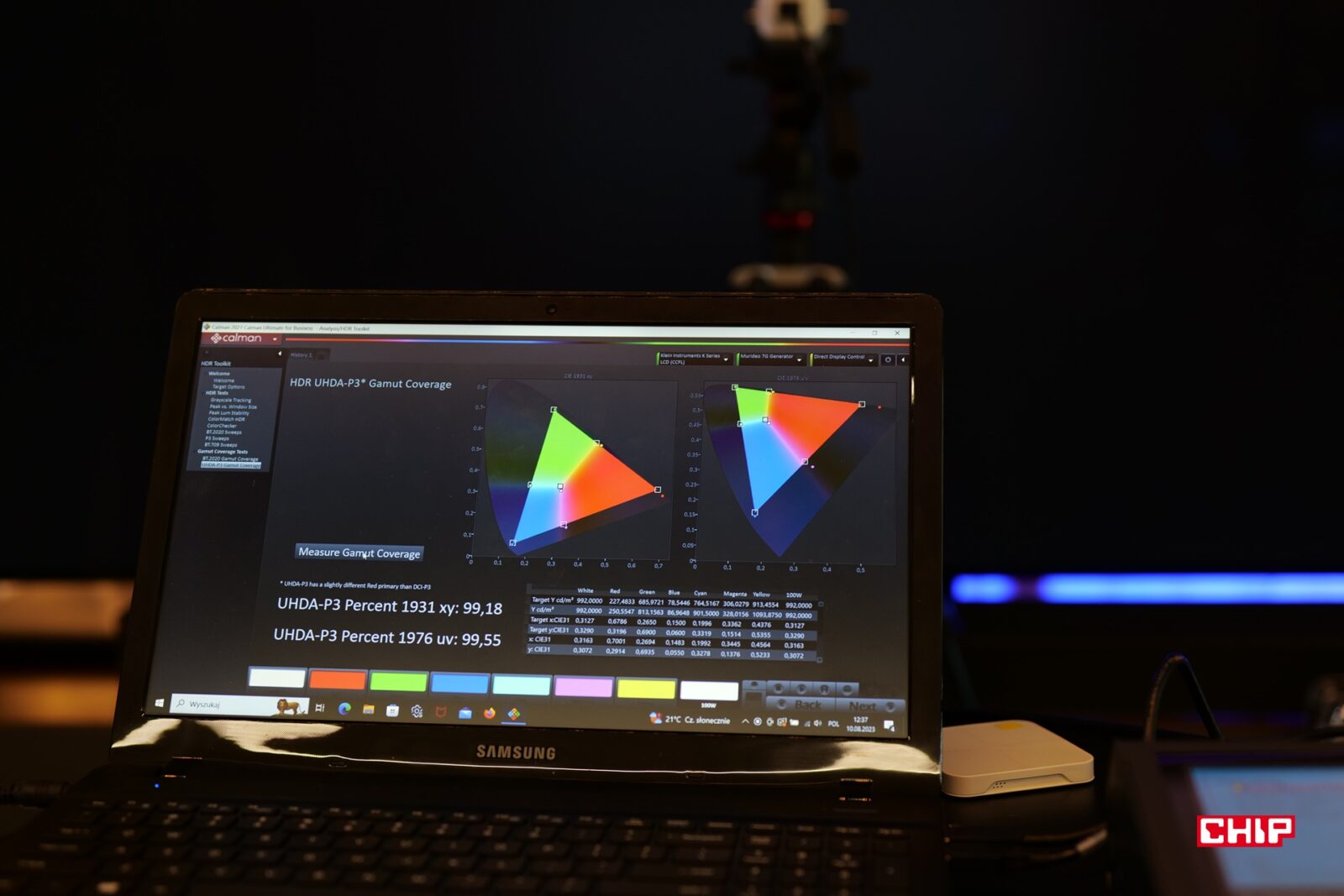 Oprócz tego sprzęt pozwolił przetestować odwzorowanie kolorów w palecie UHDA-P3, czyli odrobinę zmodyfikowanym zakresie DCI-P3. Podczas wyświetlania treści w standardzie HDR telewizor zbliża się do pełnego pokrycia palety DCI-P3. osiągając ponad 99% zarówno przy pomiarze 1931 xy, jak i 1976 uv.