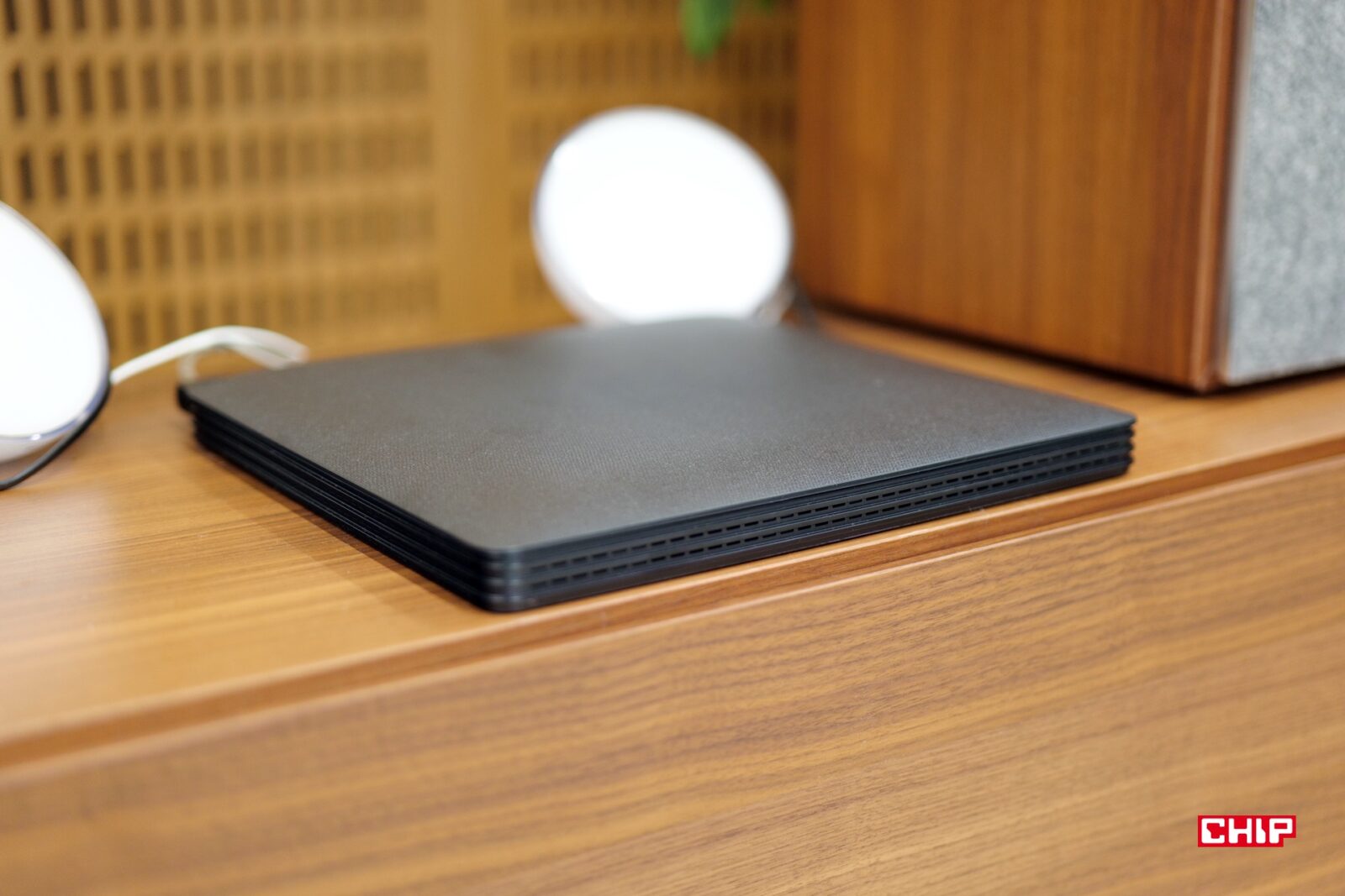 Czy smukłość telewizora ma duże znaczenie? Najwyraźniej tak, przynajmniej z perspektywy Samsunga. Koreańczycy postanowili, że S95C zostanie zbudowany tak, by mieć jedynie 11,2 milimetra grubości. To wiąże się z przeniesieniem portów poza jego obudowę. W tym miejscu pojawia się One Connect Box. Jednym kablem łączymy się z przystawką, którą stawiamy lub wieszamy obok telewizora. Na niej znajdziemy 4 porty HDMI 2.1 (w tym jeden z eARC), wejście Ethernet, optyczne wejście audio, wejście RF dla sygnału telewizji slot Common Interface+ 1.4 oraz trzy złącza USB, w tym USB-C dla kamery. Solidny zestaw, który bezprzewodowo dopełnia Bluetooth 5.2 i Wi-Fi 5.