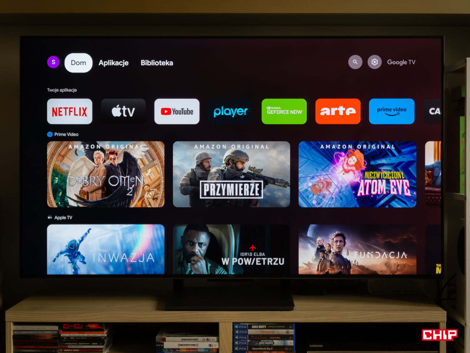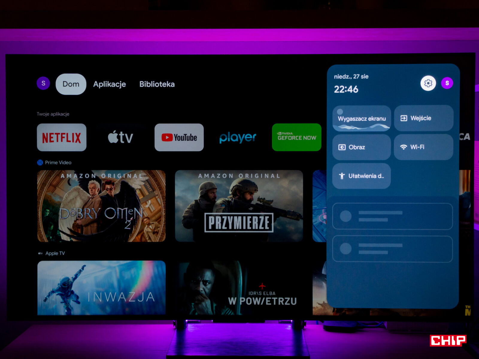 Oczywiście jak przystało na Androida, jest dostęp do najważniejszych aplikacji służących przede wszystkim do streamingu obrazu i dźwięku, (m.in. Netflix, Disney+, Prime Video, YouTube, HBO Max, Spotify, Twitch, Apple TV+, Google Play Movies, Canal+, Arte). W odróżnieniu od platform innych producentów aplikacji nam tu raczej nie zabraknie. Oprócz dostępu do globalnego panelu ustawień, na pilocie znajdziemy wygodne skróty do zmiany źródła sygnału oraz kilku najważniejszych parametrów (jasność, tryby obrazu, dźwięku, Bluetooth, Wi-Fi. Zawartość dolnego menu można na szczęście swobodnie edytować.