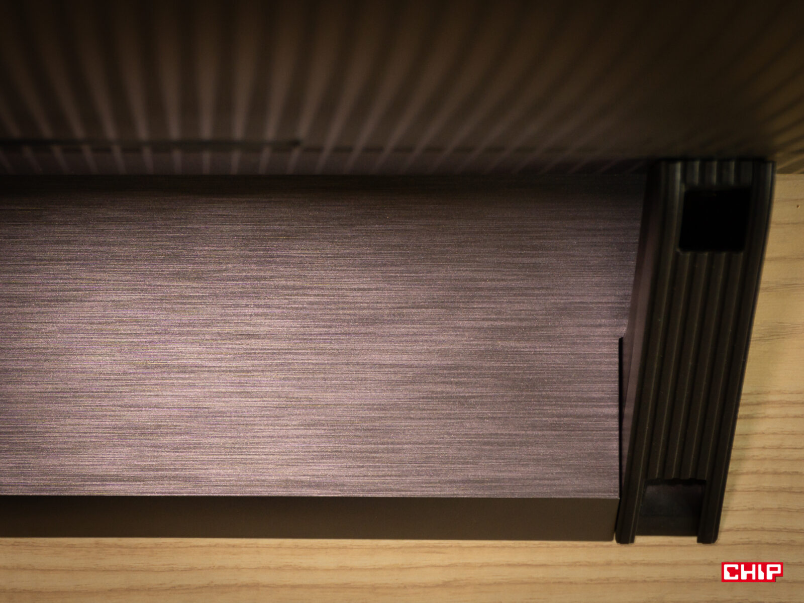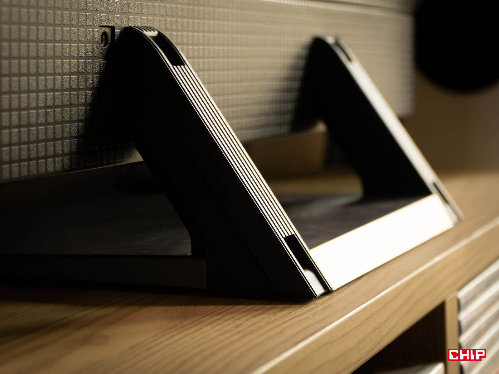 Na upartego (gdybym miał ze 20 lat mniej) pudło mieszczące TCL C745 w wariancie 55″ dałoby się pewnie samodzielnie rozpakować, wydobyć z niego sprzęt, dokręcić z tyłu dwie niewielkie nóżki, a zmontowaną całość osadzić na telewizyjnym stoliku. Zdecydowanie lepiej było jednak poprosić o pomoc drugą osobę, bo przy takich gabarytach nie ma miejsca na kozakowanie. Nóżki można przykręcić na dwóch wysokościach, ale na tym kończy się możliwość regulacji. Podstawa telewizora nie jest obracana na boki. Próbując to zrobić, przekręcamy całą konstrukcję, którą na dole spina w całość niewielka plastikowa podstawka, imitująca szczotkowane aluminium. Na szczęście nie jest to trudne, bo całość waży rozsądne 14,2 kg.