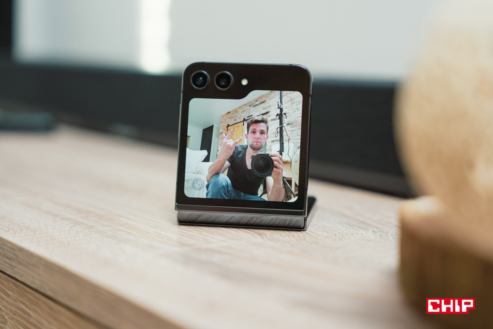Ekstremalnie słaba jest za to kamerka do selfie, z matrycą 10 Mpix. Nawet współczesne zetafony robią lepsze selfie niż kosztujący 6000 zł składany Samsung, a do tego naklejona na ekran folia ma tendencję do powodowania refleksów świetlnych. Kojarzycie motyw z „przeciętymi” zdjęciami z filmu Omen? Właśnie takie selfie robi Galaxy Z Flip 5.