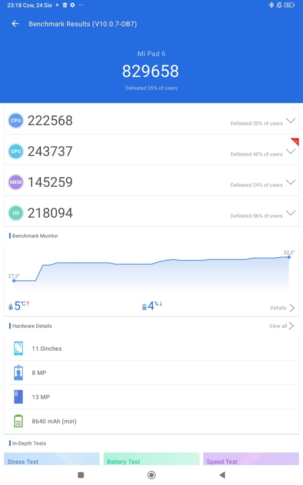 W testach wypada on więc lepiej np. od zeszłorocznego modelu Lenovo Tab P11 5G, który w dniu premiery kosztował kilkaset złotych więcej. Co więcej, tablet nie nagrzewa się zbytnio nawet pod długotrwałym obciążeniem. Nie traci przy tym również praktycznie nic ze swojej wydajności, co potwierdzają wyniki stress testów na poziomie ponad 99%. Także brawa.