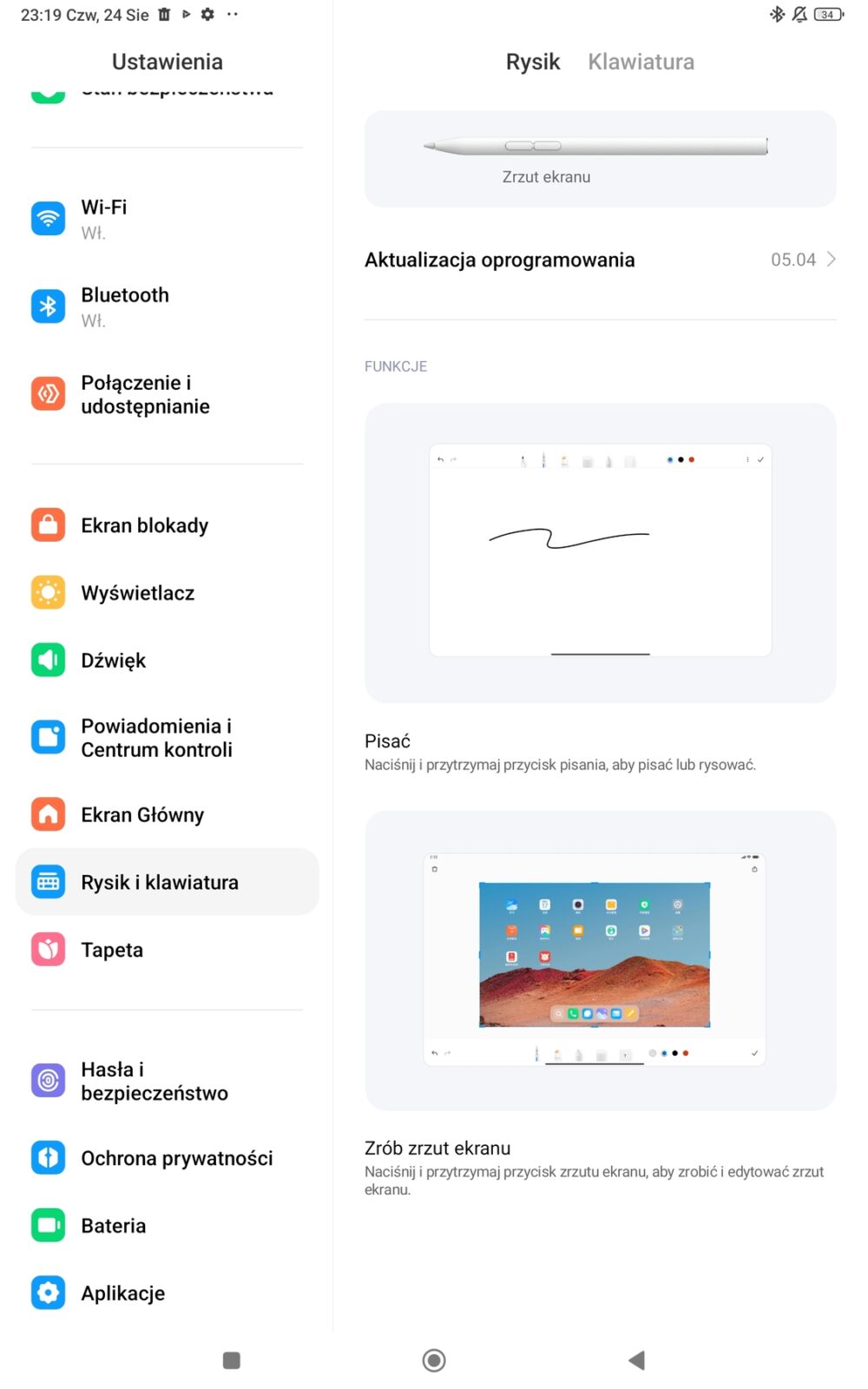 Na koniec kilka słów o rysiku Xiaomi Smart Pen 2. generacji . Jest on relatywnie duży, obsługuje 4096 punktów nacisku i jest magnetyczny – tzn. magnetycznie przypinamy go do boku tabletu (zarówno w celach transportowych, jak i ładowania. Korzystać z niego możemy w dowolny sposób, tzn. począwszy od robienia odręcznych notatek, po sterowanie tabletem, czy szkicowanie lub malowanie. Nie są to jednak tak zaawansowane funkcjonalności jak w przypadku SPena na urządzeniach od Samsunga.