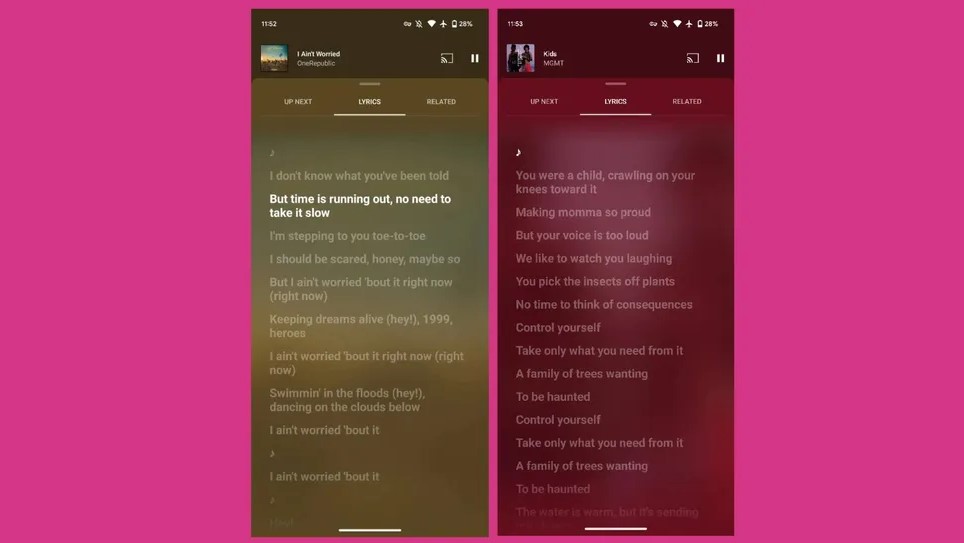Gigant z Mountain View pracował nad taką funkcjonalnością YouTube Music od dawna i po miesiącach testów w końcu udostępnił ją swoim użytkownikom. By znaleźć tekst utworu, najpierw musimy znaleźć piosenkę z dołączonym tekstem, wówczas trzeba przejść do odpowiedniej zakładki „Teksty piosenek” i gotowe. Wbrew temu, co widać było podczas testów, tekst jest teraz znacznie większy (lewa strona poniższego zrzutu ekranu), a aktualnie śpiewany fragment jest podświetlony jaśniejszym białym kolorem. Tekst jest też przewijany w miarę postępu odtwarzania utworu.