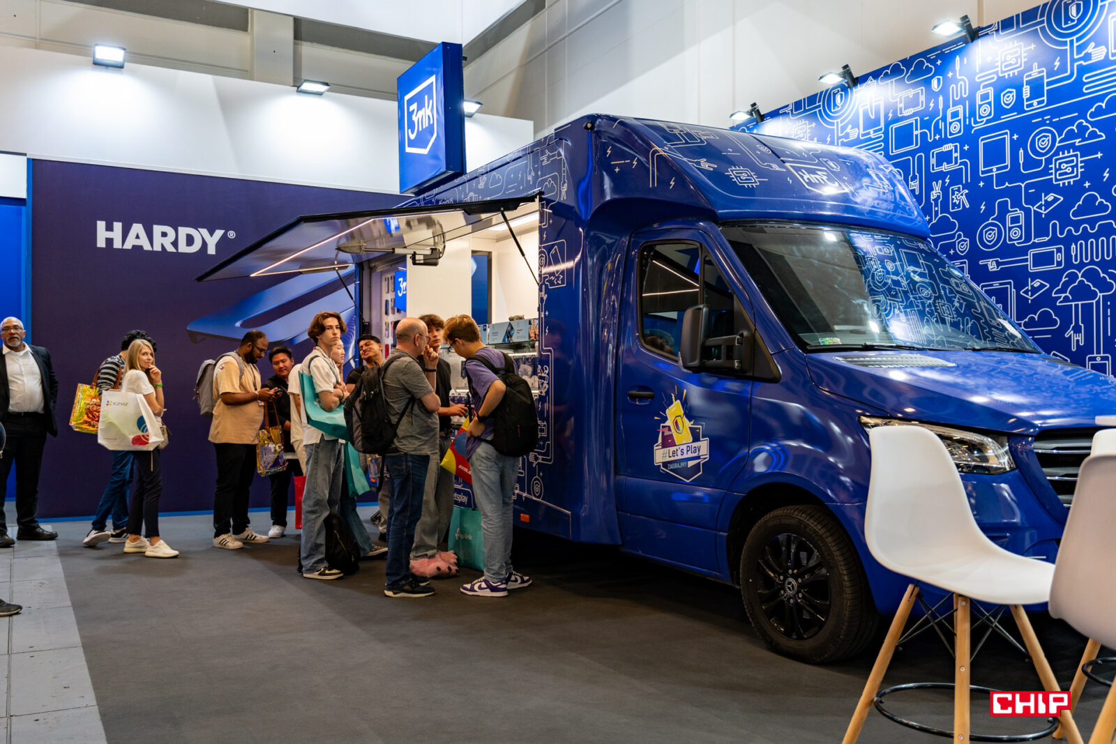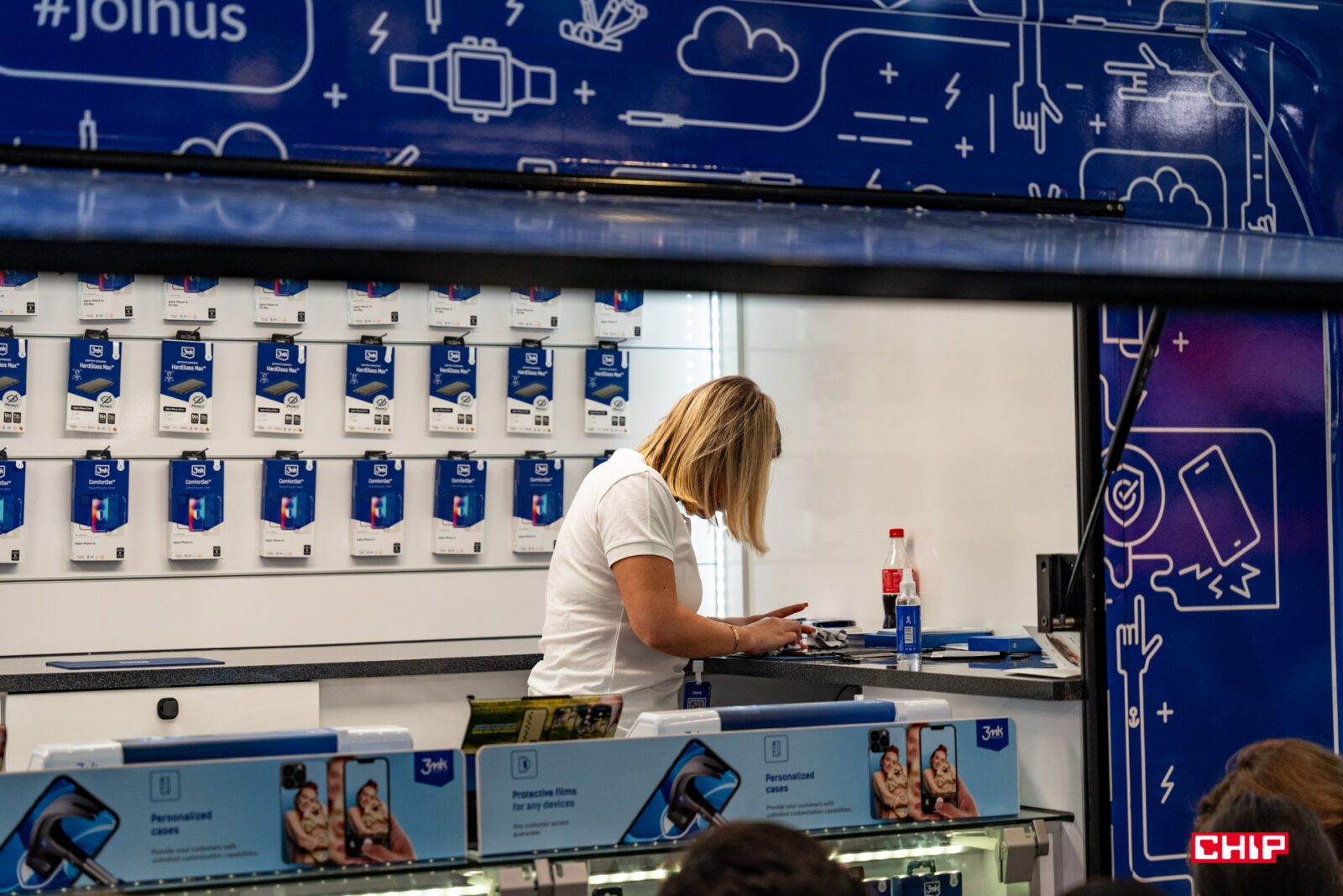 Na stoisku 3mk też znajdziemy młotek, ale firma zamiast na efektowny pokaz chce dać zwiedzającym coś bardziej namacalnego. Na stoisku znajdziemy specjalnie przygotowany samochód marki, stylizowany na food truck, gdzie możemy za darmo wymienić lub nakleić po raz pierwszy ochronę ekranu naszego smartfonu. Chętnych nie brakuje.