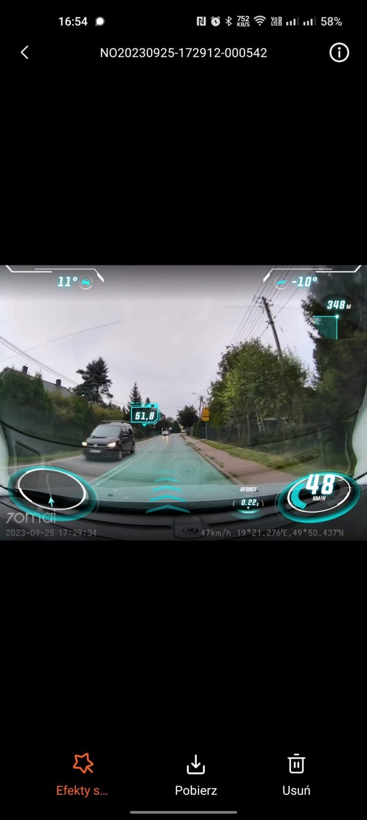 Osobiście jednak nie widzę sobie większego sensu w tym, aby wideorejestrator musiał mieć koniecznie własny wyświetlacz, jako że nie jest to potrzebne codziennemu użytkownikowi. Nieco bardziej sceptycznie patrzę na sam fakt, że bez smartfonu nie uzyskamy dostępu nie tylko do ustawień, ale nawet nagrań wideorejestratora z racji jego wbudowanej pamięci i braku możliwości wpięcia karty microSD, którą zawsze można wyjąć. Z drugiej strony zawsze możemy po prostu pobrać nagrania na smartfon, ale i tak stanowi on wtedy to najsłabsze ogniwo, które utrudnia nam dostęp do sprzętu, bo nawet wpięcie wideorejestratora do komputera zdaje się na nic.