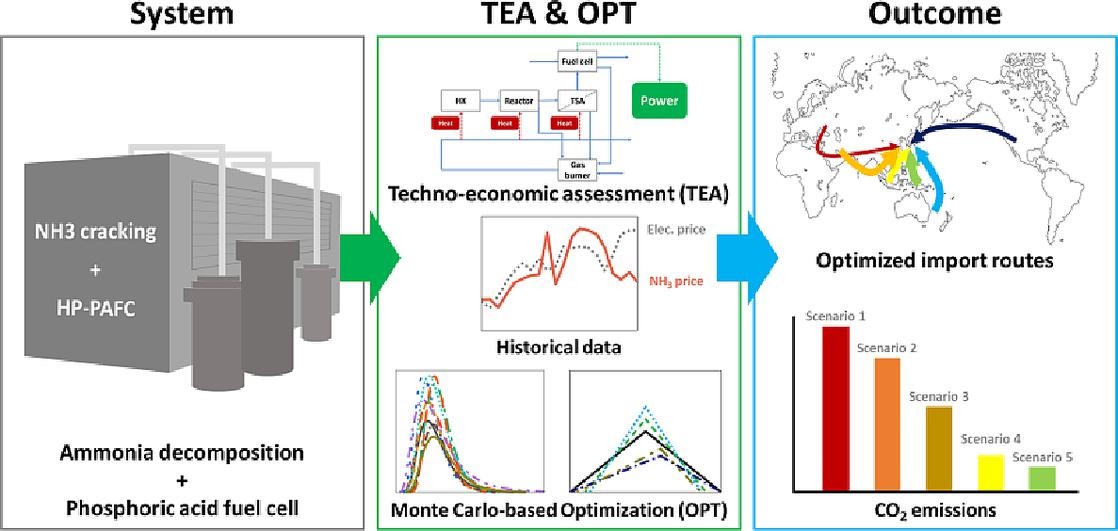 Wykorzystali oni komercyjne narzędzie do symulowania procesów. Ich celem była analiza techniczno-ekonomiczna dla importu amoniaku do Korei Południowej oraz analiza śladu węglowego tworzonego na każdym z etapów. Produkcja energii miałaby zachodzić w ogniwach paliwowych na bazie kwasu fosforowego (HP-PAFC) i być poprzedzona rozkładem amoniaku.