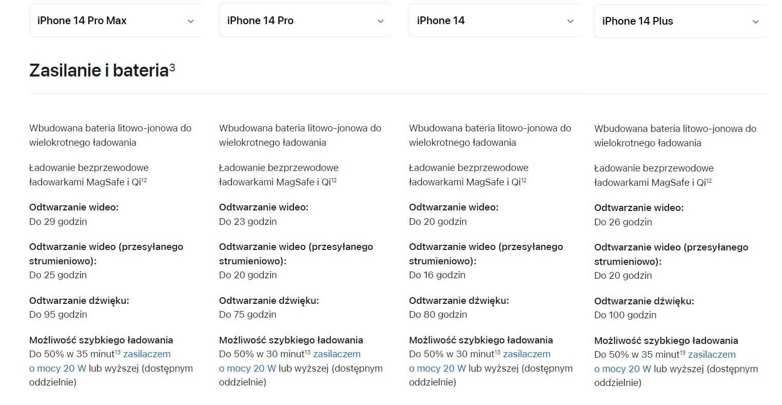 Podczas premier smartfonów, czasem pewne kwestie firmy wolą przemilczeń. W przypadku Apple’a czymś takim jest pojemność akumulatora. Producent od lat uparcie nie zdradza szczegółów na ten temat nie tylko podczas samej prezentacji, ale też na swojej stronie internetowej. Jedyne, co podaje, to czas pracy na jednym ładowaniu, posługując się np. niezbyt precyzyjnym „Do 26 godzin odtwarzania wideo”. Zwykle jest do tego dodany przypis, w którym firma wyjaśnia, w jakich warunkach można liczyć na taką żywotność.