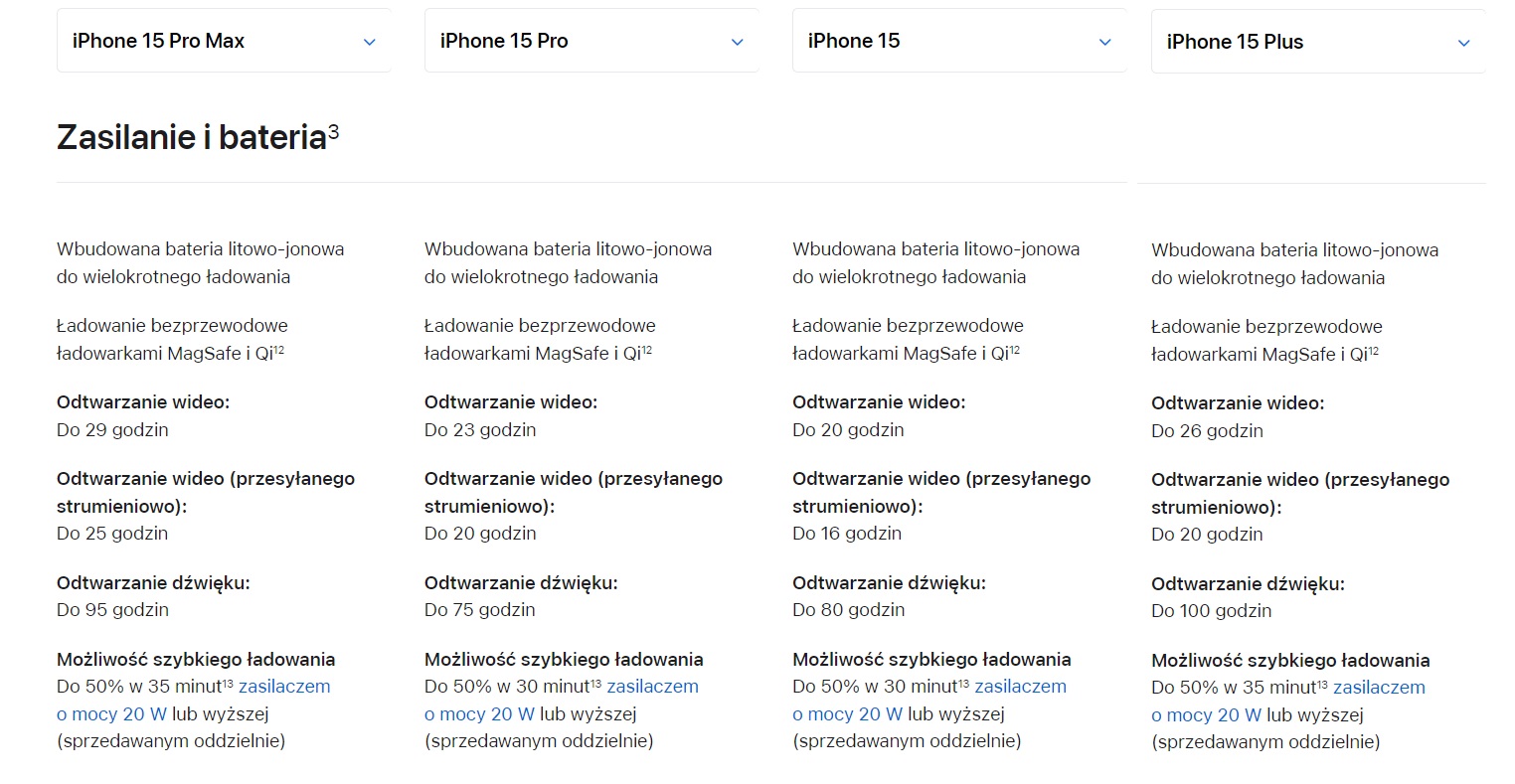 Nie inaczej jest oczywiście w przypadku iPhone’ów 15. Kiedy wejdziemy na oficjalną stronę producenta, znajdziemy tam informacje, że we wszystkich modelach znalazła się „wbudowana bateria litowo‑jonowa do wielokrotnego ładowania”, która pozwala na działanie przez określony czas. Dla iPhone’a 15 Pro Max jest to do 29 godzin odtwarzania wideo i do 95 godzin odtwarzania dźwięku. Dla modelu Pro czas ten wynosi odpowiednio 23 i 75 godzin, a dla podstawowej „piętnastki” – 20 i 80 godzin. Jest też wzmianka, że cała seria obsługuje szybkie ładowanie przewodowe. Tak, Apple wciąż posługuje się określeniem „szybkie” w stosunku do ładowania z mocą 20 W. Niezależnie jednak od użytych słów i wymiany Lightning na USB-C, napełnienie ogniwa w 50% następuje w 30-35 minut (dłużej w Pro Max). Apple podkreśla jeszcze, że „Deklarowane czasy pracy przy zasilaniu z baterii zakładają określoną konfigurację sieci i inne czynniki; rzeczywiste wyniki mogą być inne”.