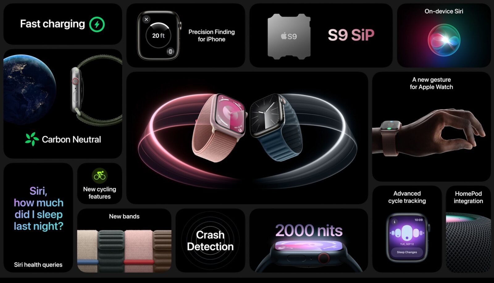 Apple Watch 9 dostał nowy procesor Apple Silicon S9. Producent zapewnia, że składa się z 60% większej liczby tranzystorów niż poprzednik, a wykorzystany układ graficzny jest o 30% szybszy. Do tego mamy 4-rdzeniową sieć neuronową, która ma całkowicie zmienić korzystanie z asystenta Siri.