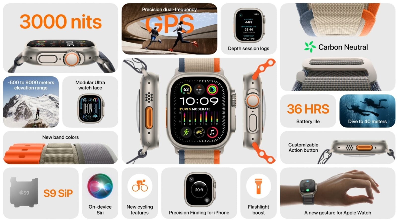 Najbardziej odporny i najlepiej wyposażony w ofercie Apple Watch Ultra 2 zaoferuje te same funkcje co Apple Watch 9 plus kilka dodatków. Takich jak ekran o jasności aż 3000 nitów, czy dwuzakresowy GPS.