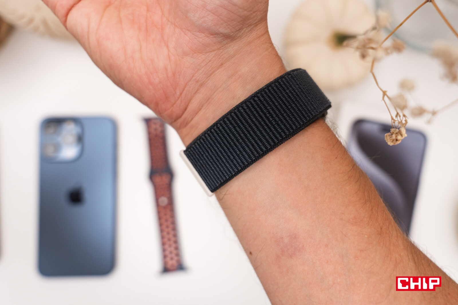 Obudowa aluminiowego Series 9 wykonana jest z materiału pochodzącego z recyclingu. Podobnie rzecz się ma z nową opaską sportową, jak również z nowymi opaskami z tworzywa, takimi jak widoczna na zdjęciu opaska Nike. Została ona wykonana ze zużytych opasek Apple’a, a mimo to nie czuć, aby miało to jakikolwiek wpływ na jakość. Przydało za to opasce unikalnego stylu, bo z racji sposobu jej produkcji, nie ma dwóch identycznych egzemplarzy. Nie mogę też złego słowa powiedzieć na opaskę sportową, również recyclingowaną, jest ona bardzo komfortowa i podejrzewam, że dla większości konsumentów będzie najlepszym wyborem przy zakupie nowego Apple Watcha.