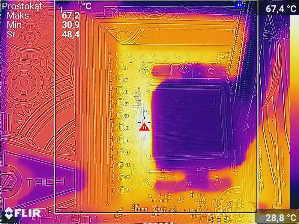 Czujnik na płycie pokazywał kolejno 64°C i 69°C. Temperatury są więc całkowicie w porządku. Płyta nie ma żadnych problemów z procesorem nawet po OC, więc spokojnie możecie na niej montować najwydajniejsze jednostki.