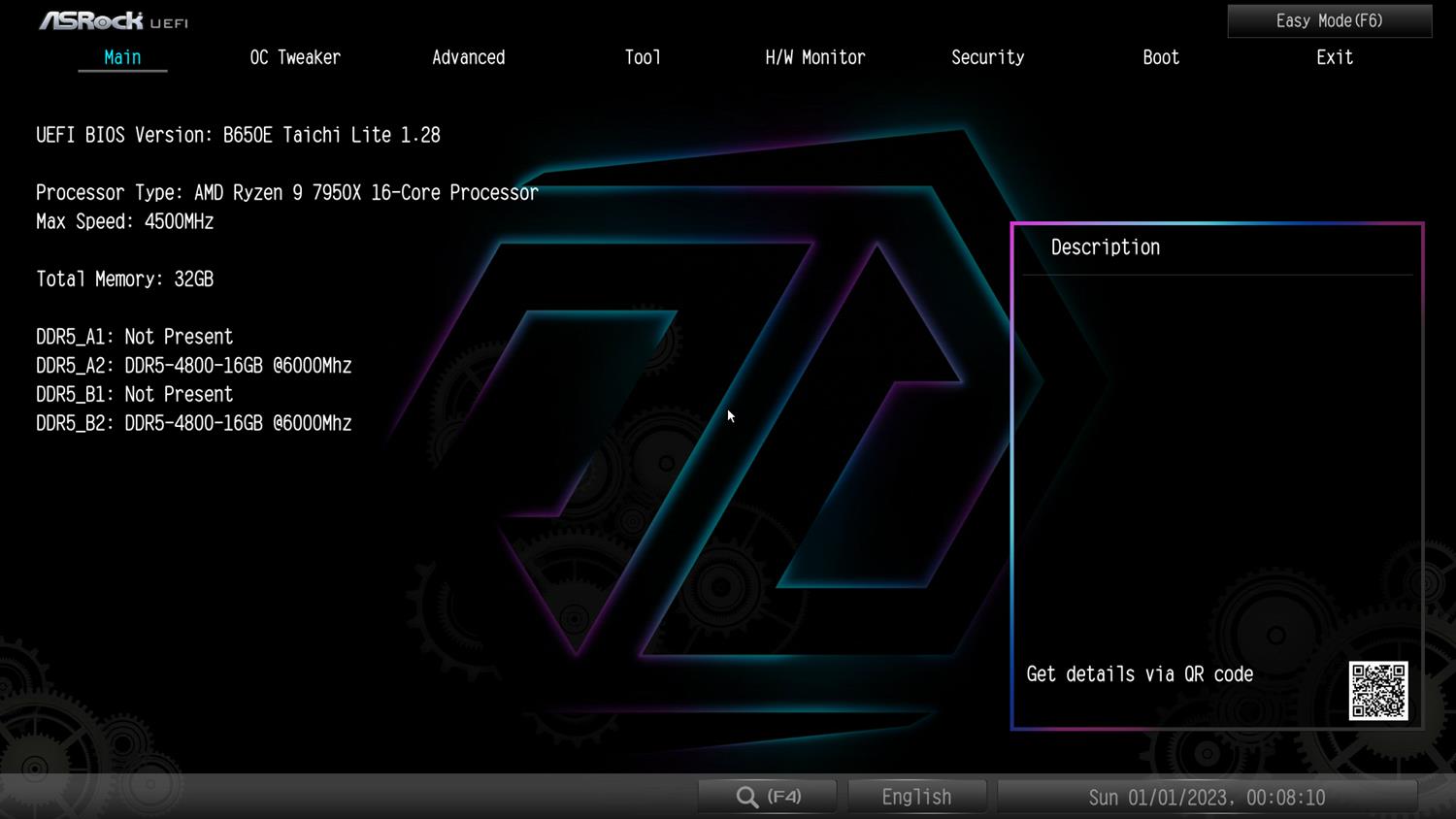 ASRock B650E Taichi Lite ma cztery miejsca na pamięci RAM DDR5. Maksymalna prędkośc to 6600 MHz, a pojemność 192 GB. Nie zabrakło wsparcia dla profili XMP i EXPO. Redakcyjne G.Skille 6000 MHz z EXPO zadziałały bez problemów, chociaż na najnowszym BIOSie ich trening zajął sporo czasu. Nie brakuje też obwodu ochronnego, który zmniejsza ryzyko uszkodzenia kości.