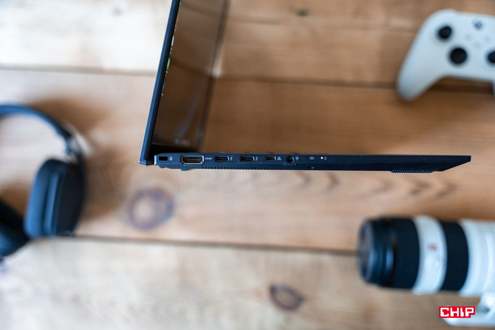 - 1x USB 3.2 Gen 2, 2x USB-C Thunderbolt 4, 1x microHDMI (RJ45), 1x HDMI 2.1, 1x Jack 3,5mm, czytnik linii papilarnych we włączniku,