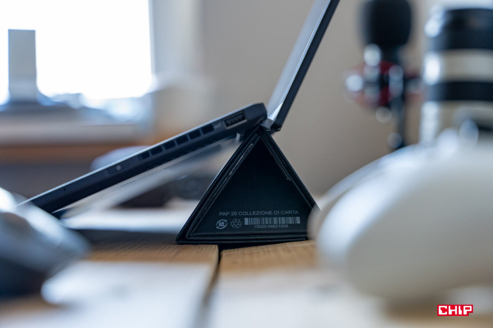 Obudowa rozkłada się do 180 stopni, a przy lekko odchylonym ekranie, w charakterystyczny dla Asusa sposób unosi delikatnie spód ku górze, ustawiając klawiaturę pod lekkim skosem. W zestawie znajdziemy składane opakowanie, w którym zapakowana jest ładowarka. Po złożeniu w graniastosłup służy za dodatkową podstawkę. To ciekawe rozwiązanie.