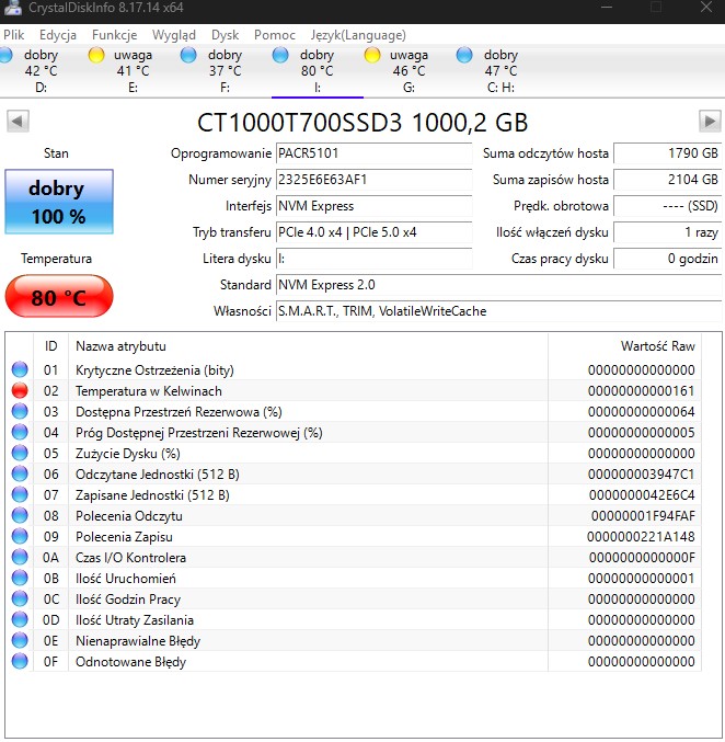 Crucial podkreśla oficjalnie, że dysku T700 w wersji bez radiatora nie powinniśmy używać bez systemu chłodzenia w celu uzyskania najwyższej wydajności. To rzeczywiście ma sens, jako że 80 stopni przy prostym teście jest już przesadnie wysoką temperaturą.