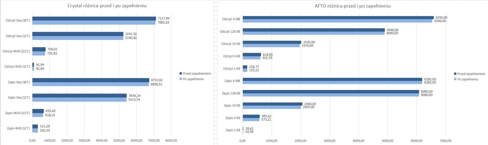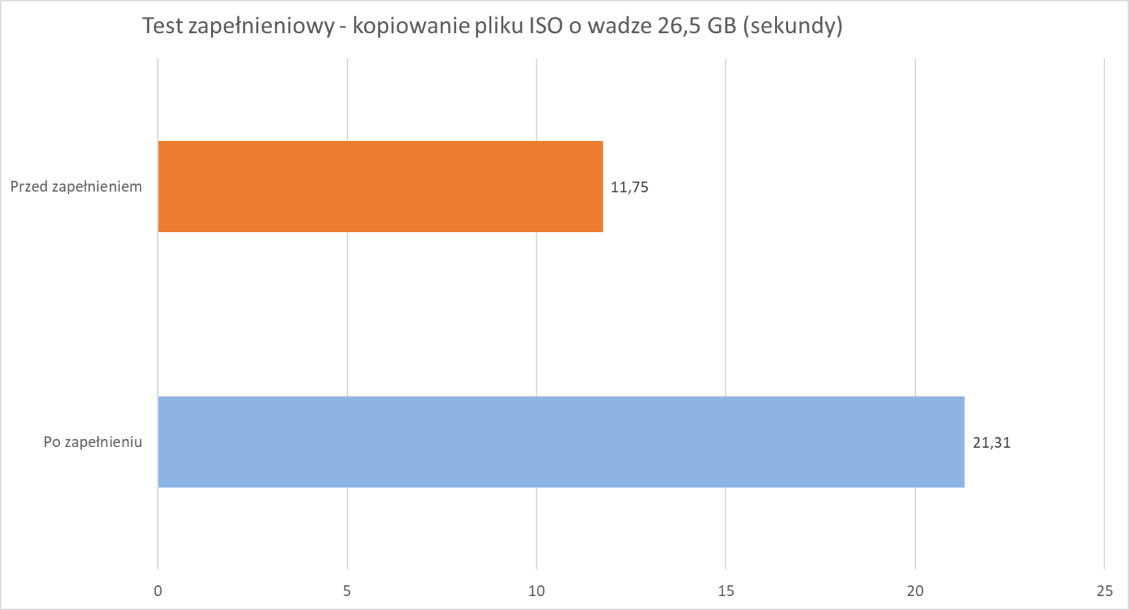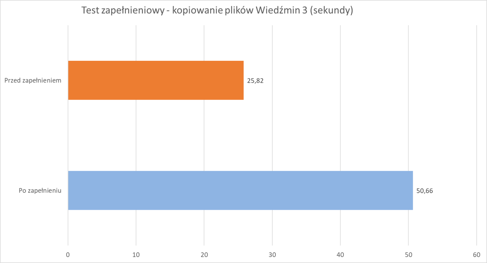 Spadek wydajności po zapełnieniu 90-95% dysku pokazują dopiero rzeczywiste testy, wydłużając czas kopiowania aż dwukrotnie. W testach syntetycznych spadki są jednak niewielkie, co może potencjalnie wprowadzać w błąd.