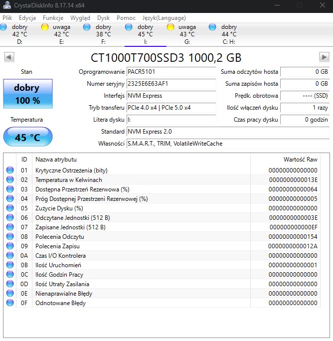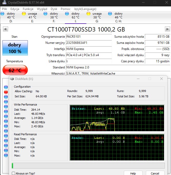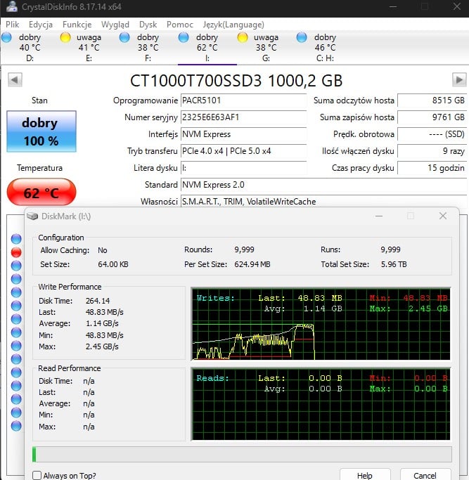 Innymi słowy, to podstawa podstaw, nad którą nie ma co się rozpisywać. Może pomijając sam kontroler, a więc nowinkę z początku bieżącego roku w formie dwurdzeniowego i ośmiokanałowego kontrolera dla SSD w segmencie konsumenckim, którego produkuje się z wykorzystaniem litografii 12 nm FinFET od TSMC. Dominacja tej firmy na rynku potwierdza zresztą, że o wydajność czy trwałość PS5026-E26 nie musimy się martwić. Na papierze równie dobrze prezentuje się wydajność tego dysku, bo wedle firmy Crucial, T700 zapewnia do 11700 MB/s sekwencyjnego zapisu oraz 9500 MB/s sekwencyjnego zapisu, co po stronie operacji losowych przekłada się na 1500000 IOPS.