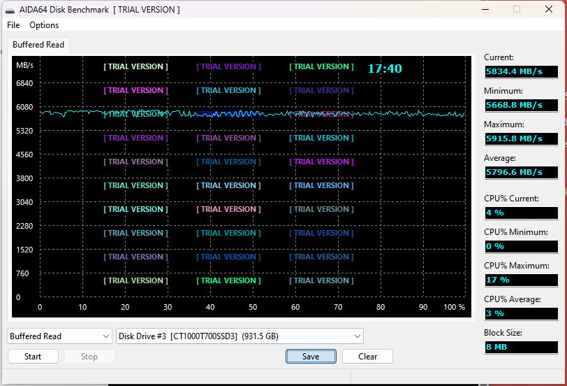 Crucial T700 jest jednocześnie niewrażliwy na nagły spadek wydajności po pewnym czasie od obciążenia, co oznacza tyle, że albo jego bufor jest szalenie pojemny, albo sam dysk jest go całkowicie pozbawiony, utrzymując stałą wydajność odczytu sekwencyjnego.