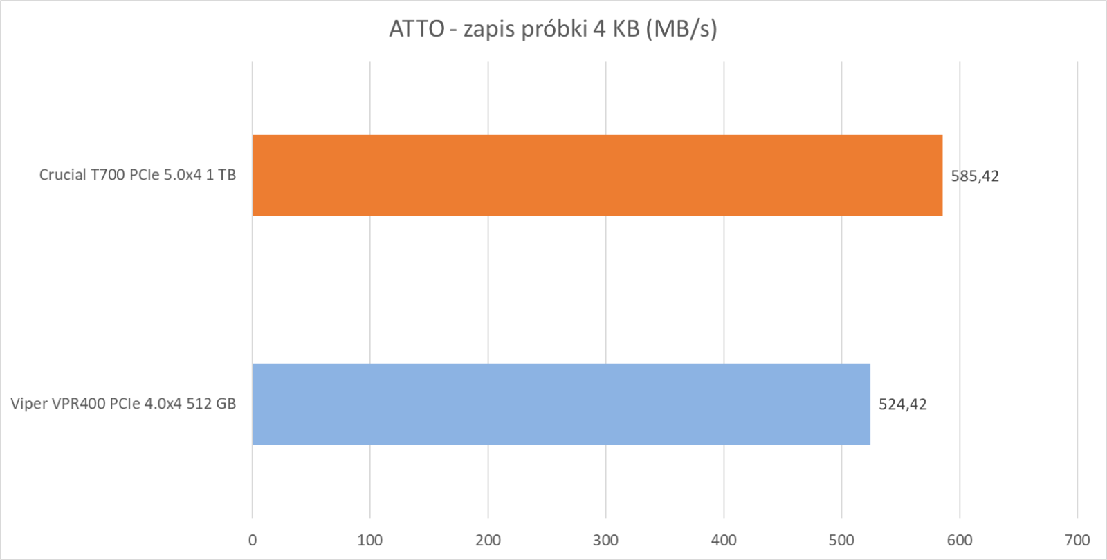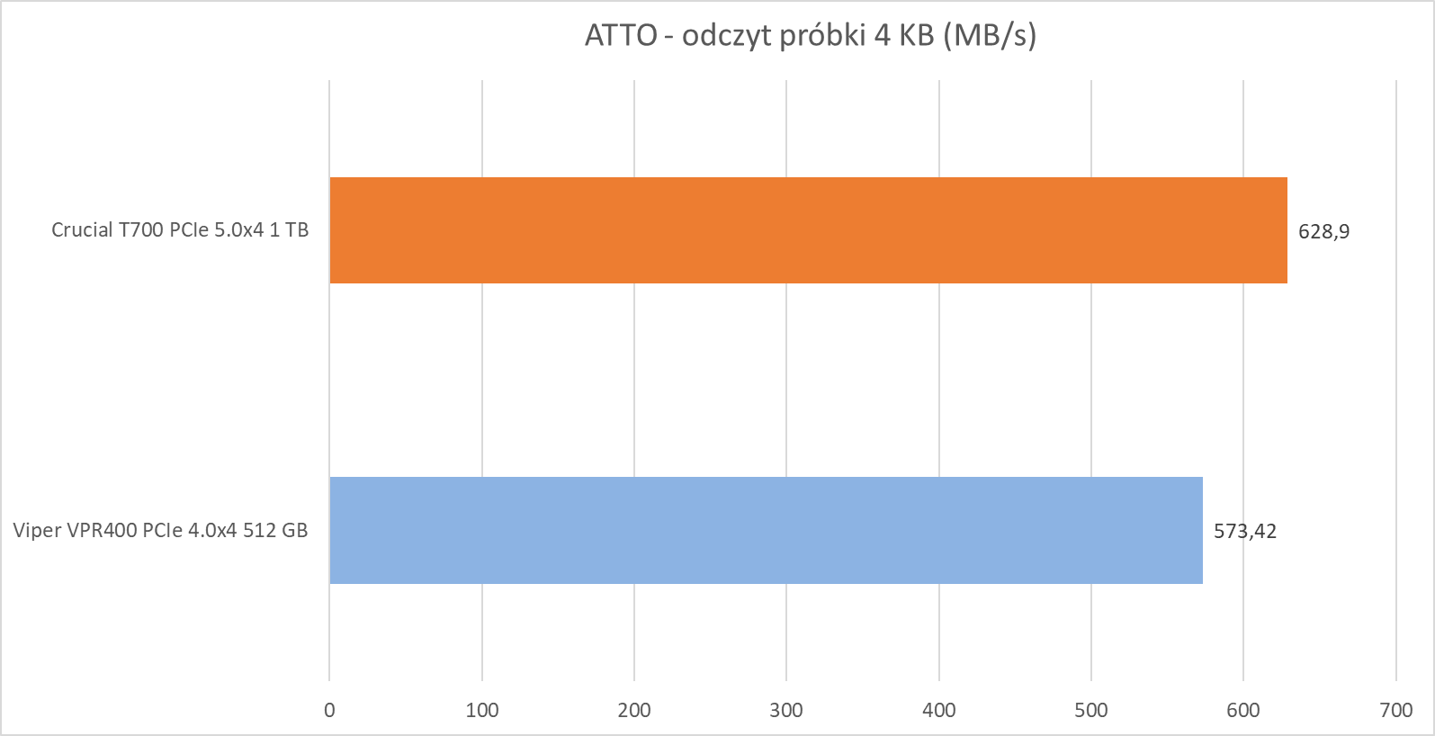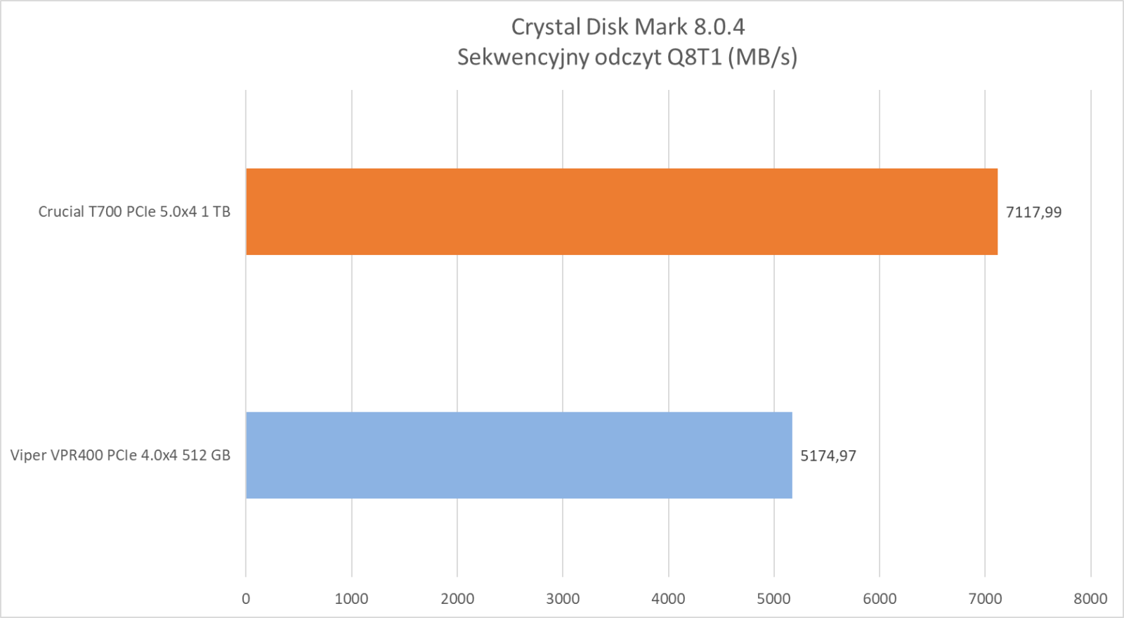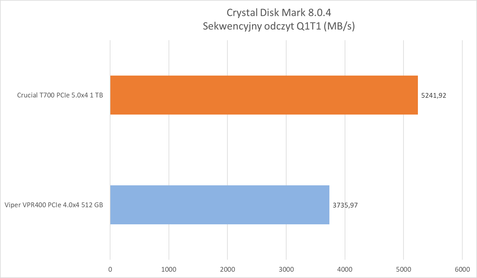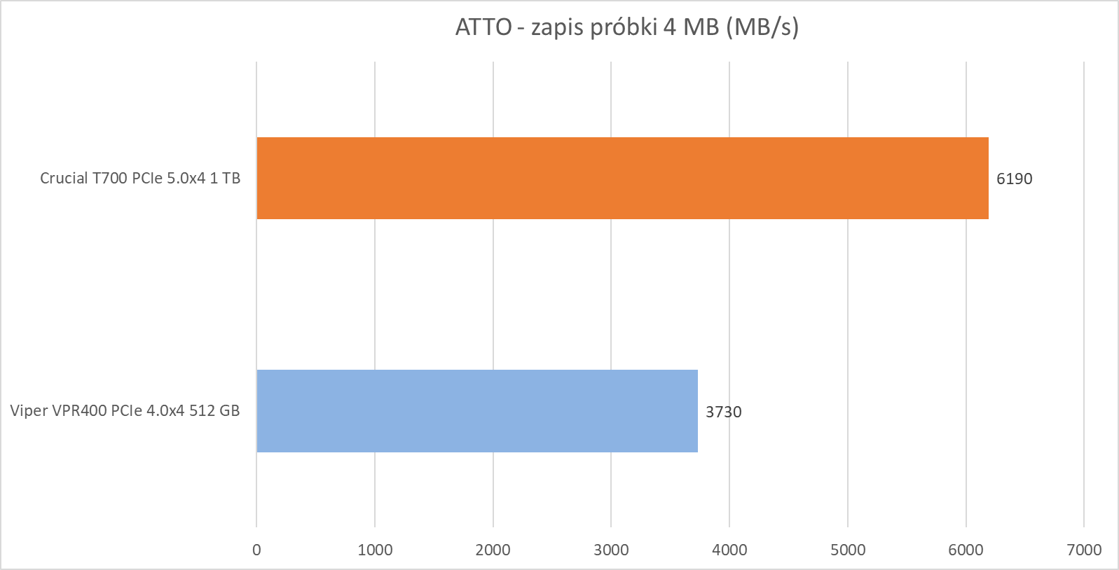 Można spytać – gdzie ta wydajność? Producent obiecywał pięciocyfrowe wyniki, a tu proszę, oba programy nie przekroczyły nawet poziomu 8000 MB/s. Wyższą wydajność T700 widać jednak, jak na dłoni, choć momentami różnica nie jest tak wielka, jakbyśmy tego chcieli.