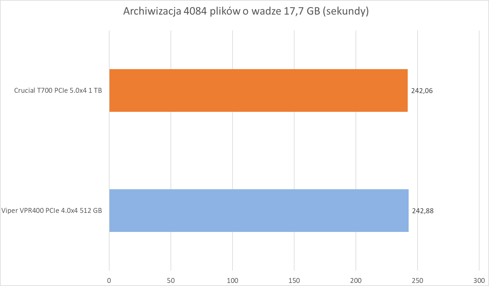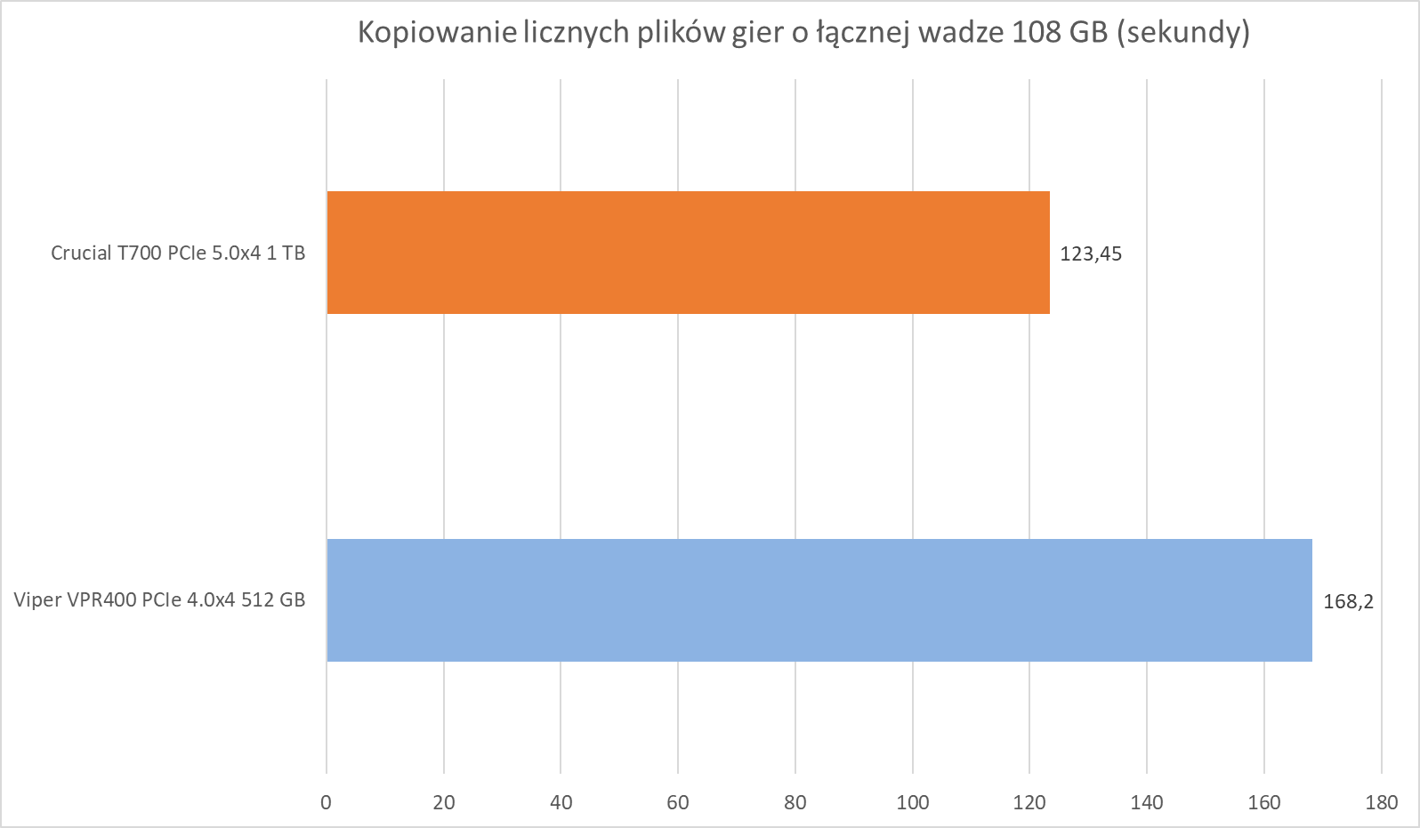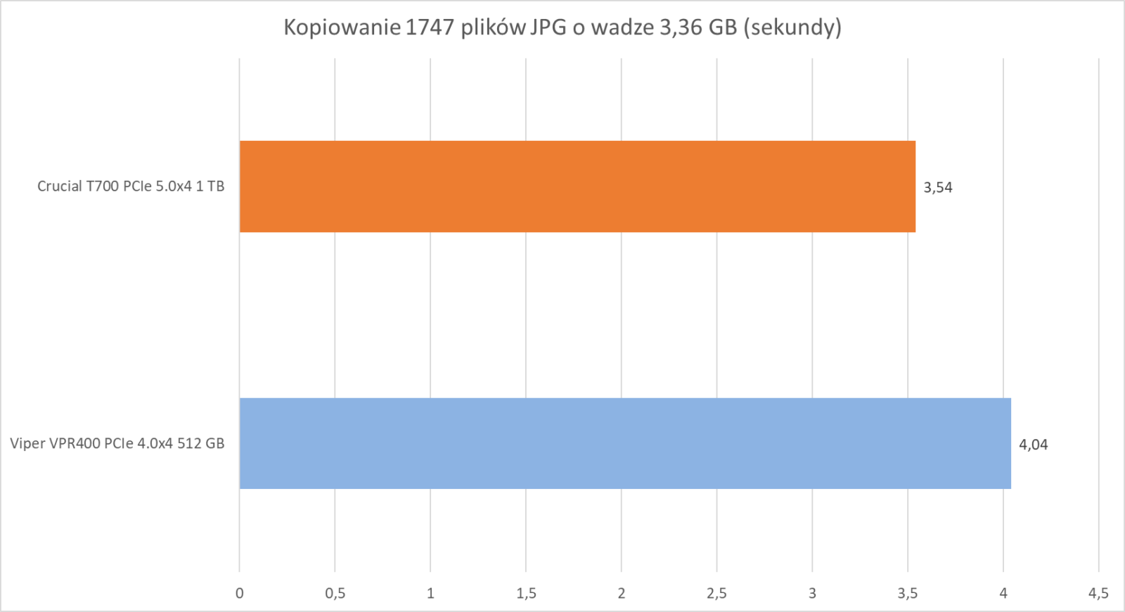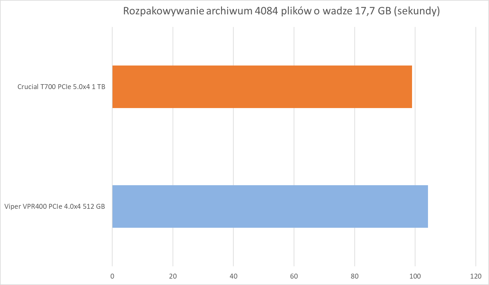 Zgodnie z oczekiwaniem, wszelkie operacje na plikach Crucial T700 wykonuje znacznie szybciej względem dysku na PCIe 4.0 i to nawet pomimo tego, że zarówno T700 nie należy do czołówki SSD nowej generacji, jak i jego konkurent jest jednym z wydajniejszych dysków.