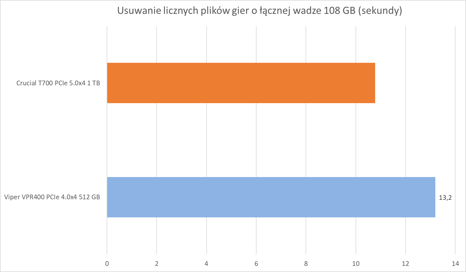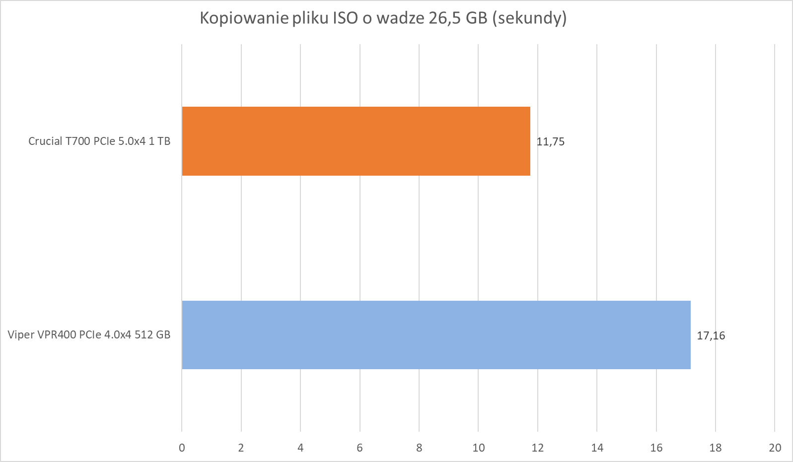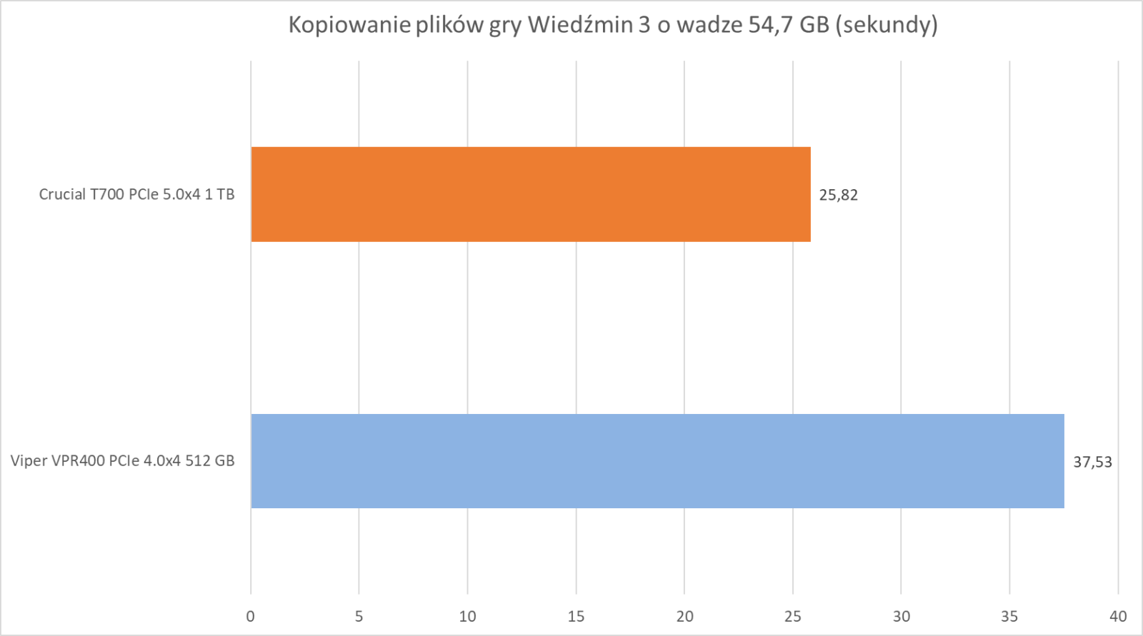 Zgodnie z oczekiwaniem, wszelkie operacje na plikach Crucial T700 wykonuje znacznie szybciej względem dysku na PCIe 4.0 i to nawet pomimo tego, że zarówno T700 nie należy do czołówki SSD nowej generacji, jak i jego konkurent jest jednym z wydajniejszych dysków.