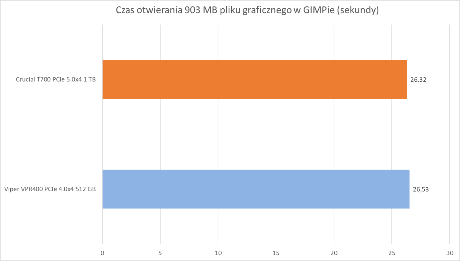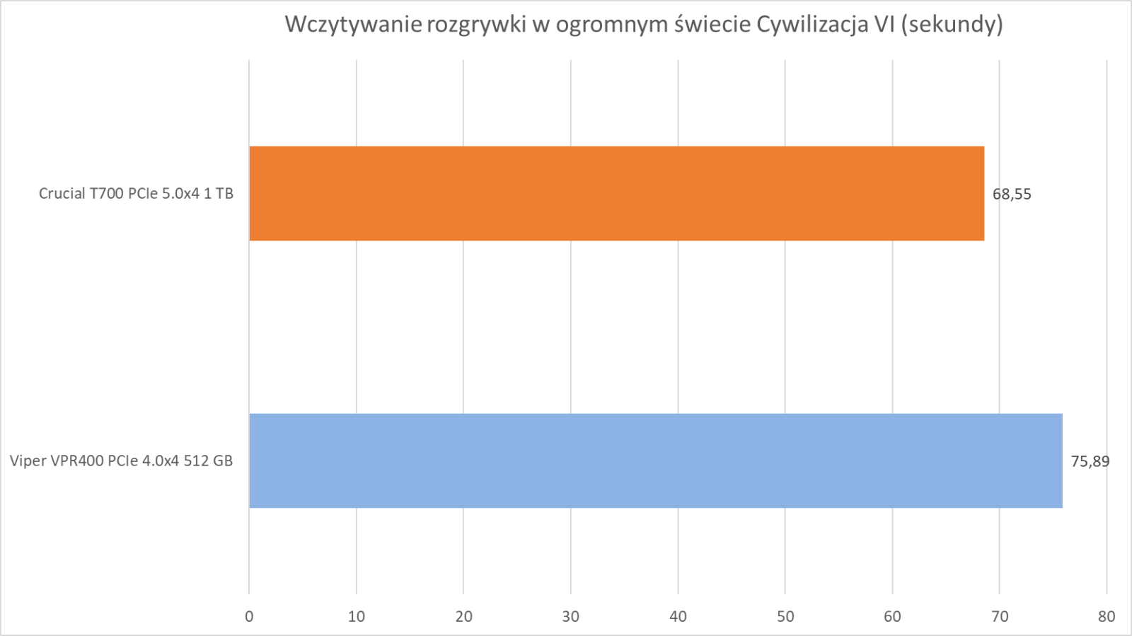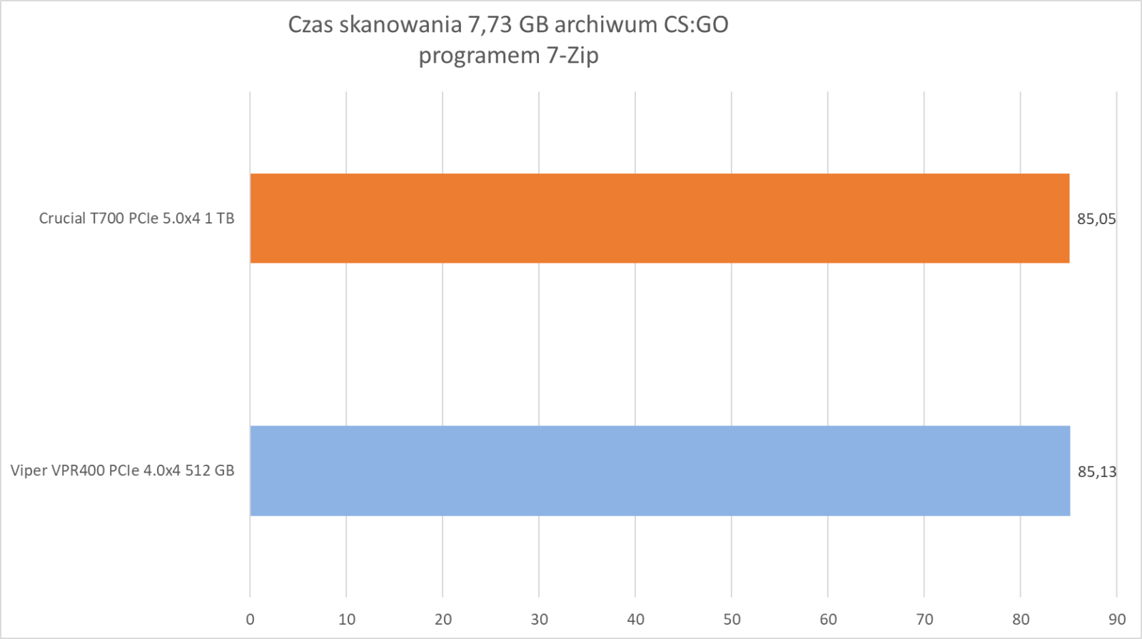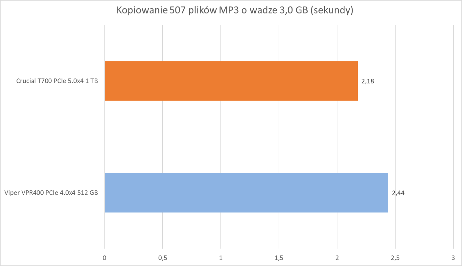 Zgodnie z oczekiwaniem, wszelkie operacje na plikach Crucial T700 wykonuje znacznie szybciej względem dysku na PCIe 4.0 i to nawet pomimo tego, że zarówno T700 nie należy do czołówki SSD nowej generacji, jak i jego konkurent jest jednym z wydajniejszych dysków.