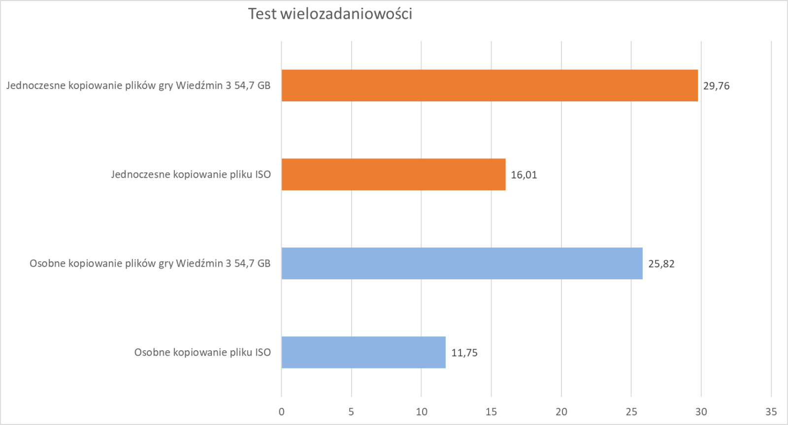 Matematyka mówi wszystko. Osobne wykonywanie obu procesów kopiowania wokół jednej partycji zajmuje ponad 37,5 sekundy, a robienie tego jednocześnie, zajmuje jedynie 29,76 sekundy. Innymi słowy, T700 nie cierpi na problemy z wielozadaniowością.