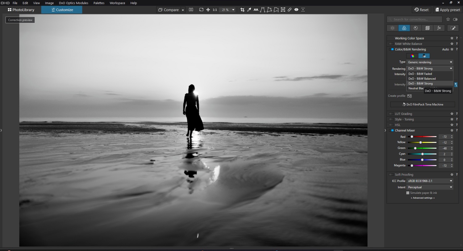 Ale DxO PhotoLab 7 to nie tylko odświeżona obsługa koloru. Program dostał wydzieloną zakładkę wyłącznie na potrzeby obróbki w czerni i bieli, z sześciokanałowym mikserem kanałów na potrzeby pełnej kontroli tonalności obrazów monochromatycznych.