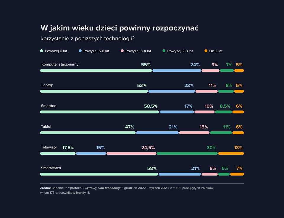 Na szczególnym cenzurowanym w rodzicielskim postrzeganiu nowych technologii wśród najmłodszych są smartfony. W tej kategorii urządzeń dopuszczenie do użytku po przekroczeniu dopiero 6. roku życia wyznaczyło aż 58,5% ankietowanych. Kompletne przeciwieństwo za to telewizor – tylko 17% badanych rodziców uważa, że dzieci powinno się przed nie wpuszczać dopiero po przekroczeniu bariery wiekowej 6 lat. Może wydawać się szokujące, że nawet 30% respondentów nie widzi nic złego w zaznajomieniu dzieci w wieku 2-3 lat z telewizją, a poniżej drugiego roku życia przed odbiornik pozwoliłoby wpuścić 13% zapytanych w badaniu the:protocol rodziców. Jest jeszcze grupa 6%, która dałaby dzieciom poniżej 2. roku życia do ręki smartfon i tablet.
